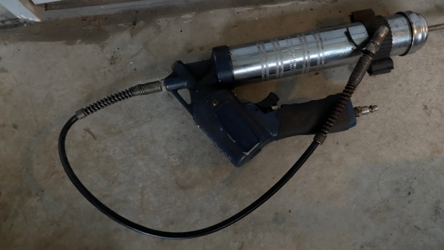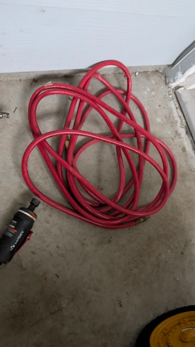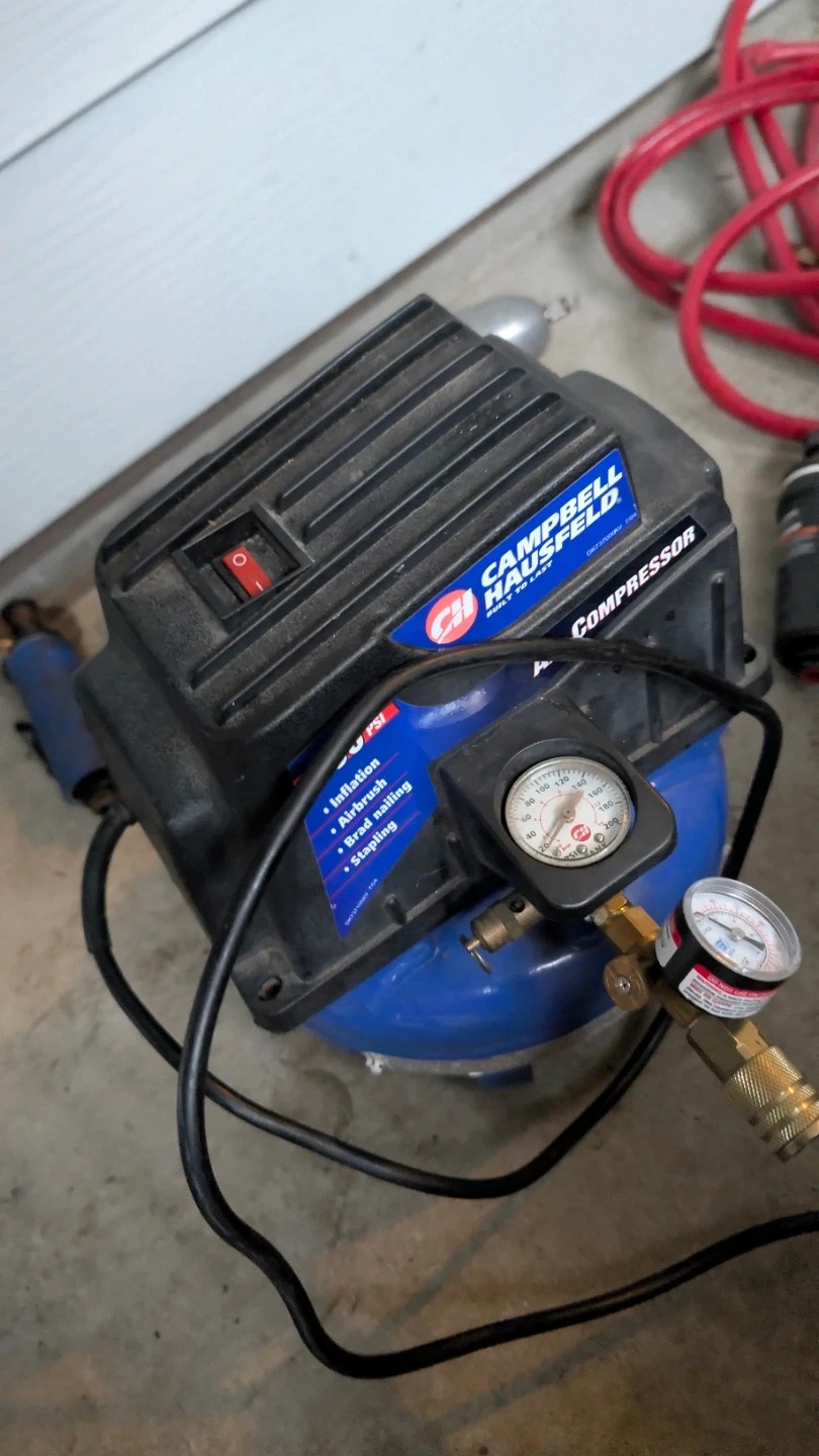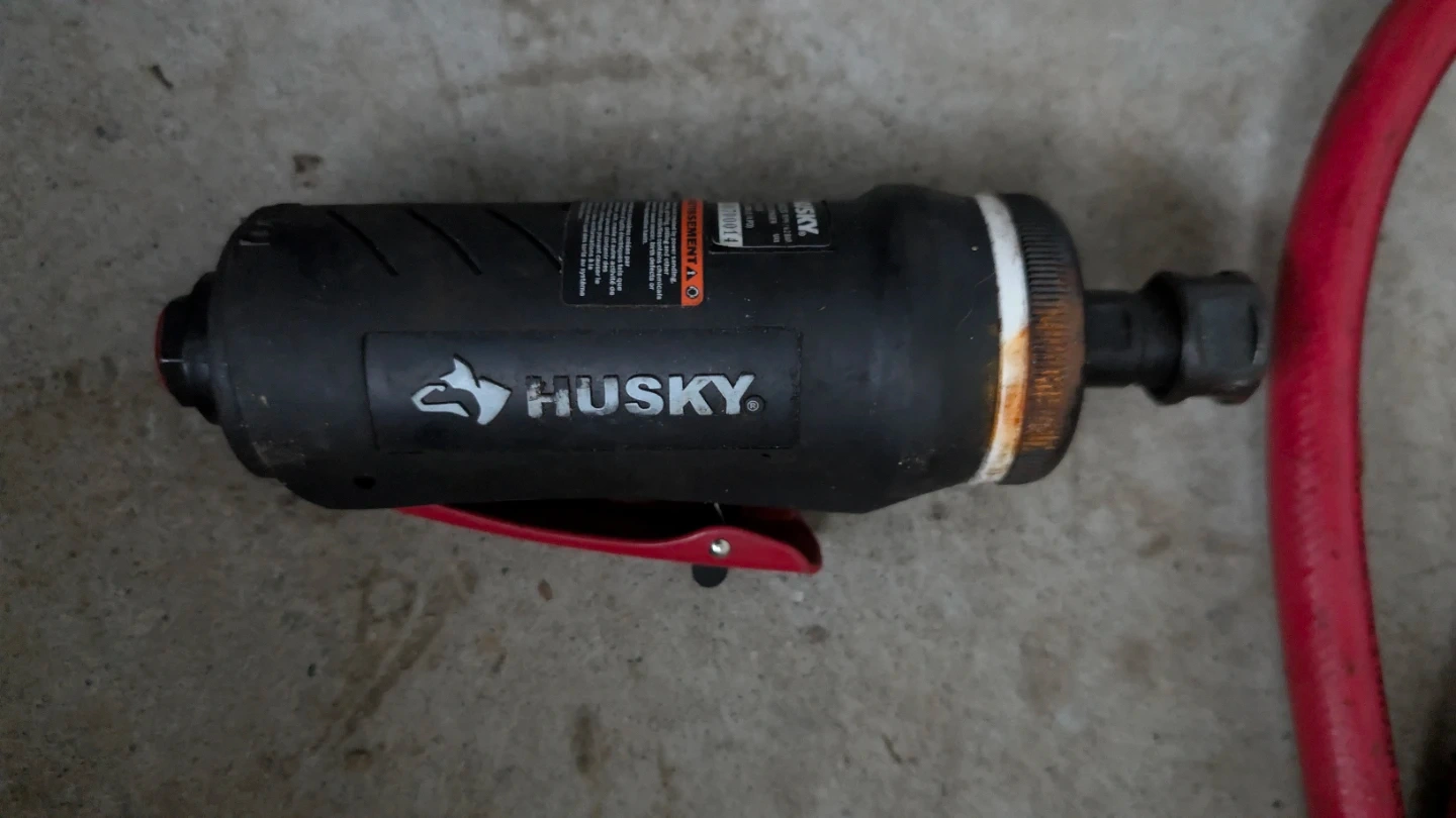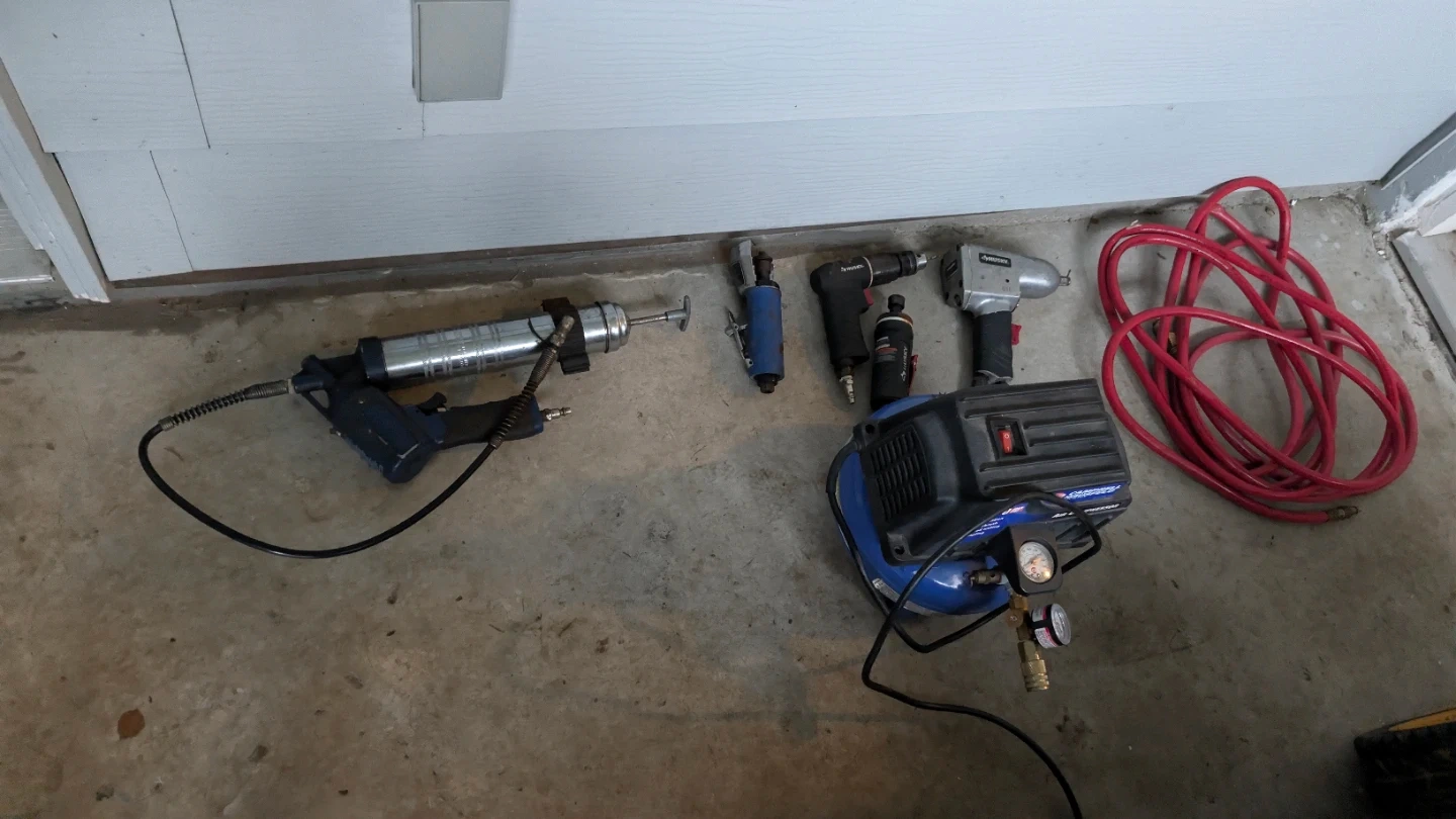 Campbell Hausfeld 100 PSI compressor, pneumatic grease gun, Husky impact gun, Husky air drill, blue air die grinder, small Husky straight air die grinder (inline), 25 ft red air hose, and fittings.