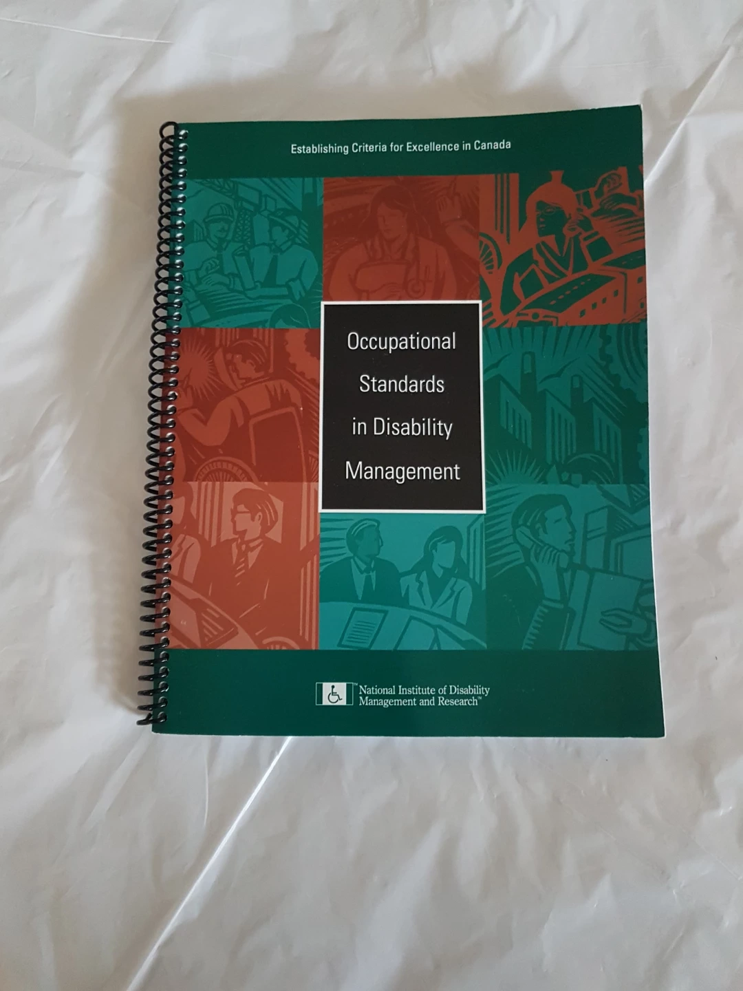 This book outlines occupational standards in disability management. It's published by the National Institute of Disability Management and Research. "Establishing Criteria for Excellence in Canada" is also indicated on the cover.