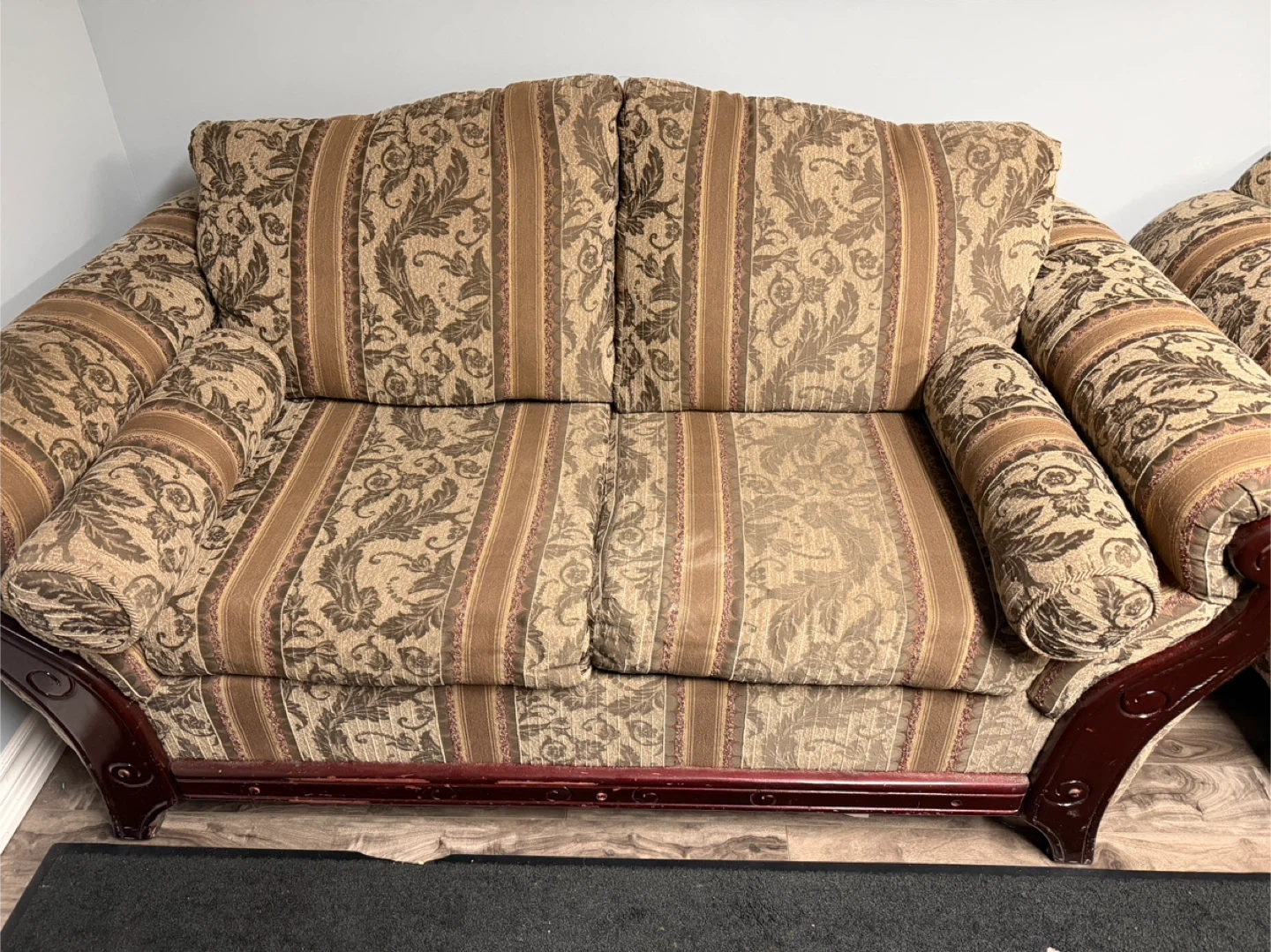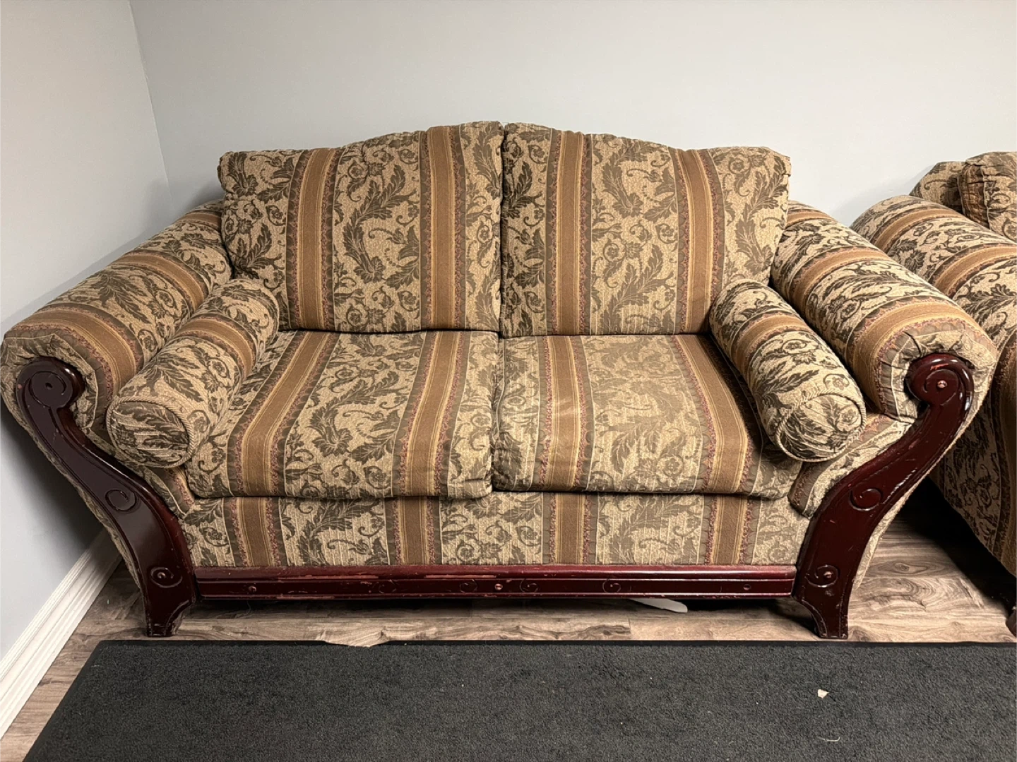 This fabric loveseat features a traditional damask-style pattern in brown and beige tones. It has rolled arms and ornate dark wood trim along the base and arms. Perfect for a living room or den, along with sofa chair.