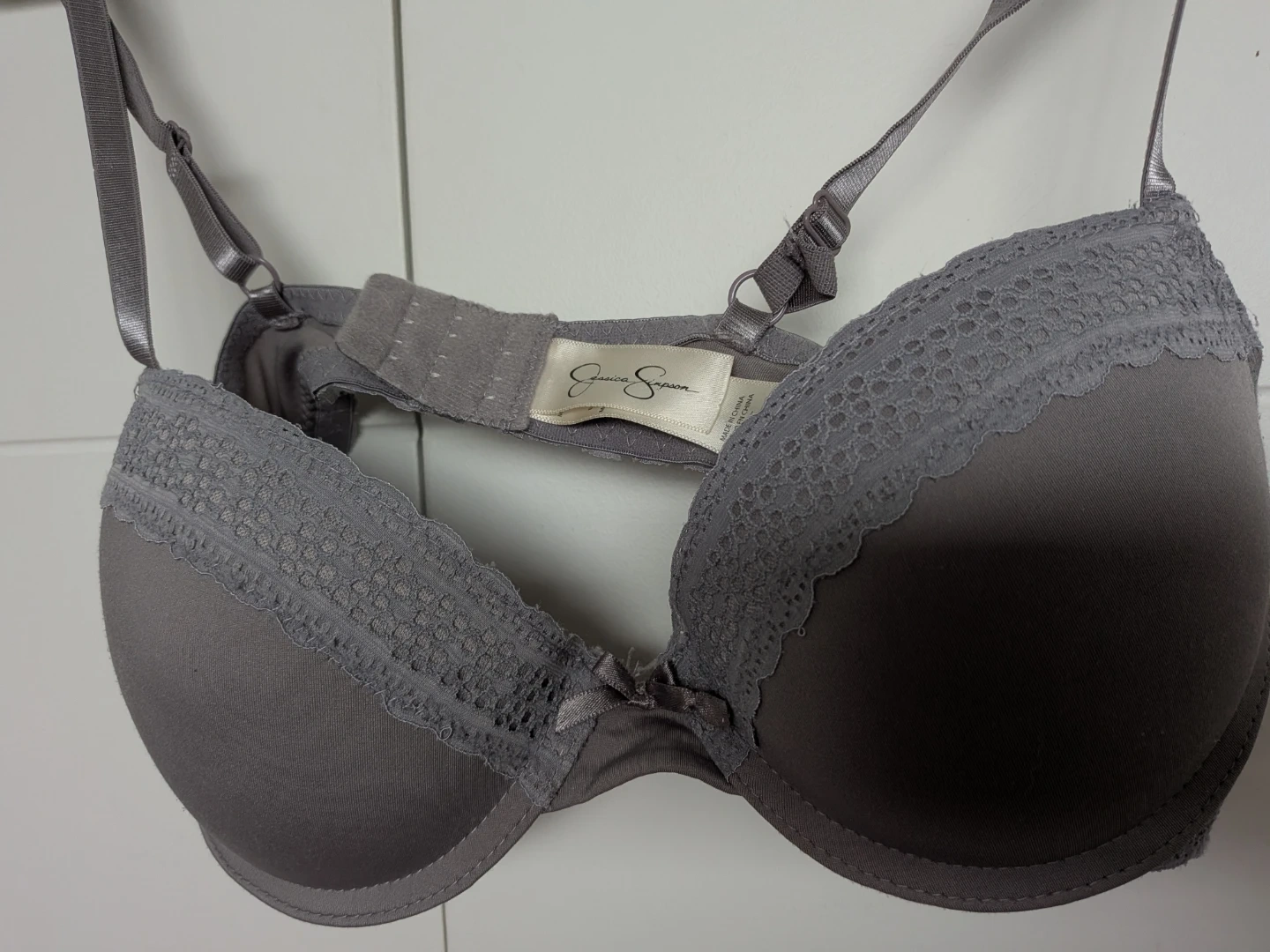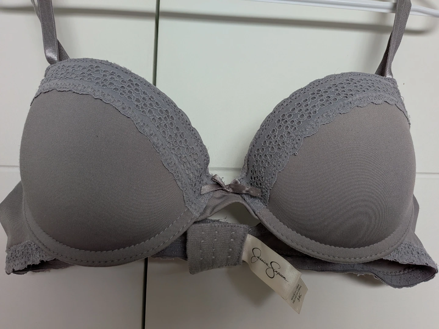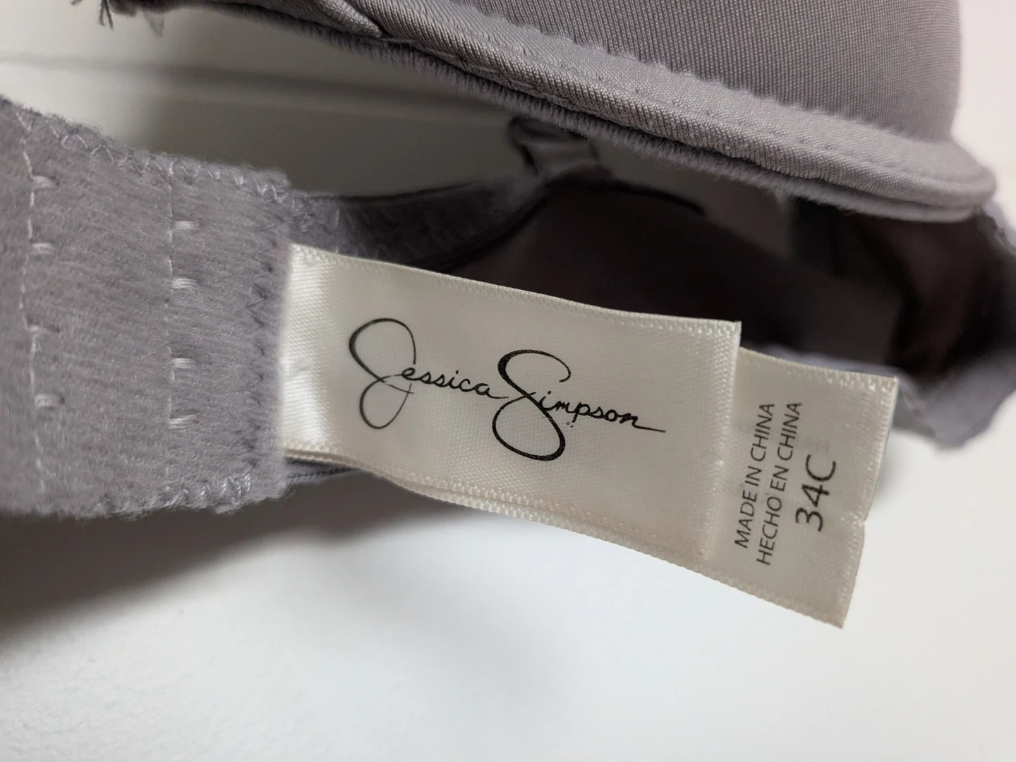 Jessica Simpson push-up bra in a soft grey colour. It features lace trim and a small bow detail. Underwire support with adjustable straps. Size 34C.
