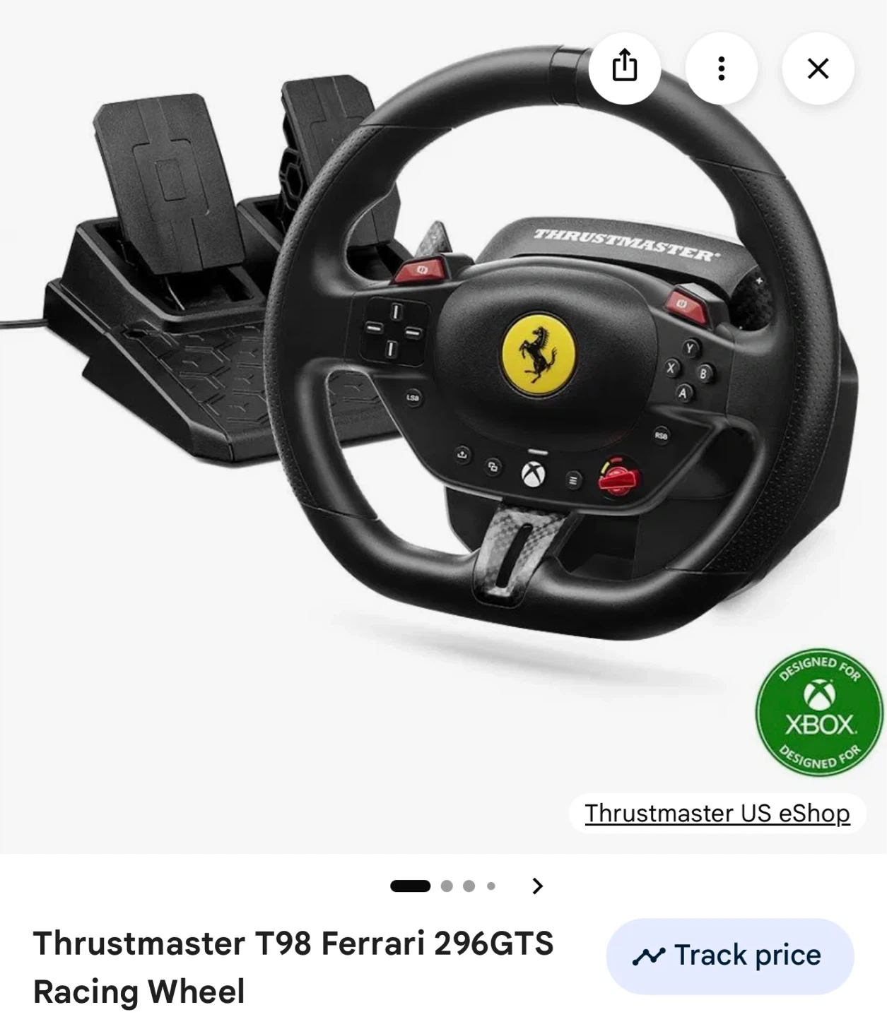 This is a Thrustmaster T98 Ferrari 296GTS racing wheel. It's designed for Xbox. Includes a pedal set.