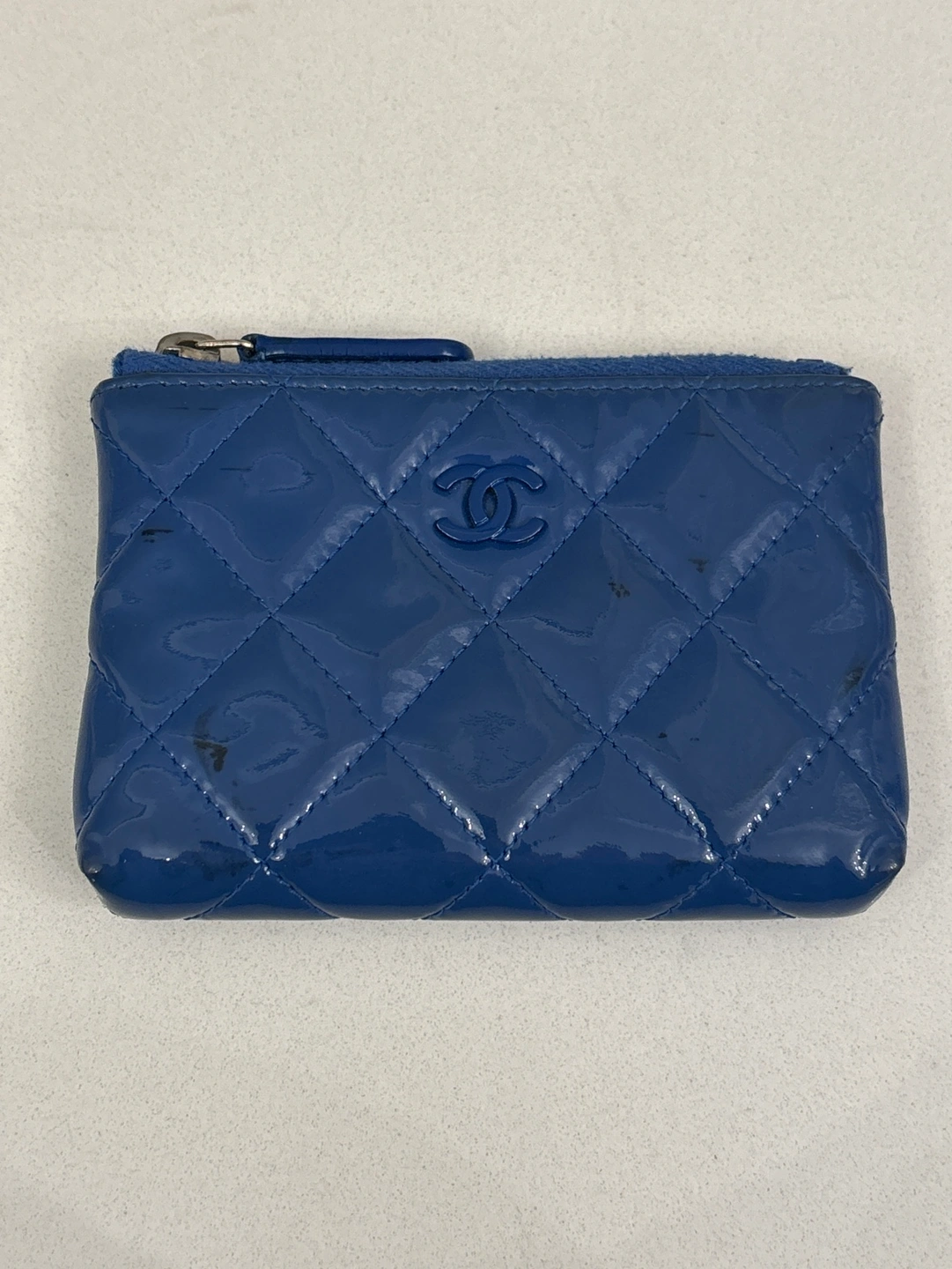 Small blue quilted patent leather coin purse with a chain key ring. Zipper closure. Visible marks on leather. Chain has tarnished. Fair condition