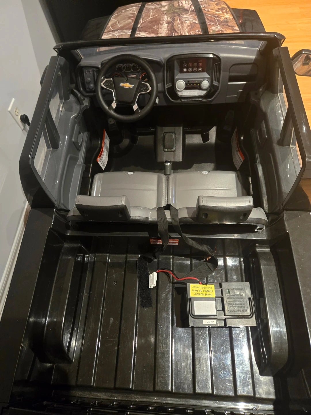 This is a Chevrolet Silverado LTZ ride-on truck for kids. It's black with camouflage accents on the hood, doors, and tailgate. It features realistic details like a steering wheel and seats. Has a battery and charger. Has 2 seating capacity and trunk. Pretty big. $300 obo.