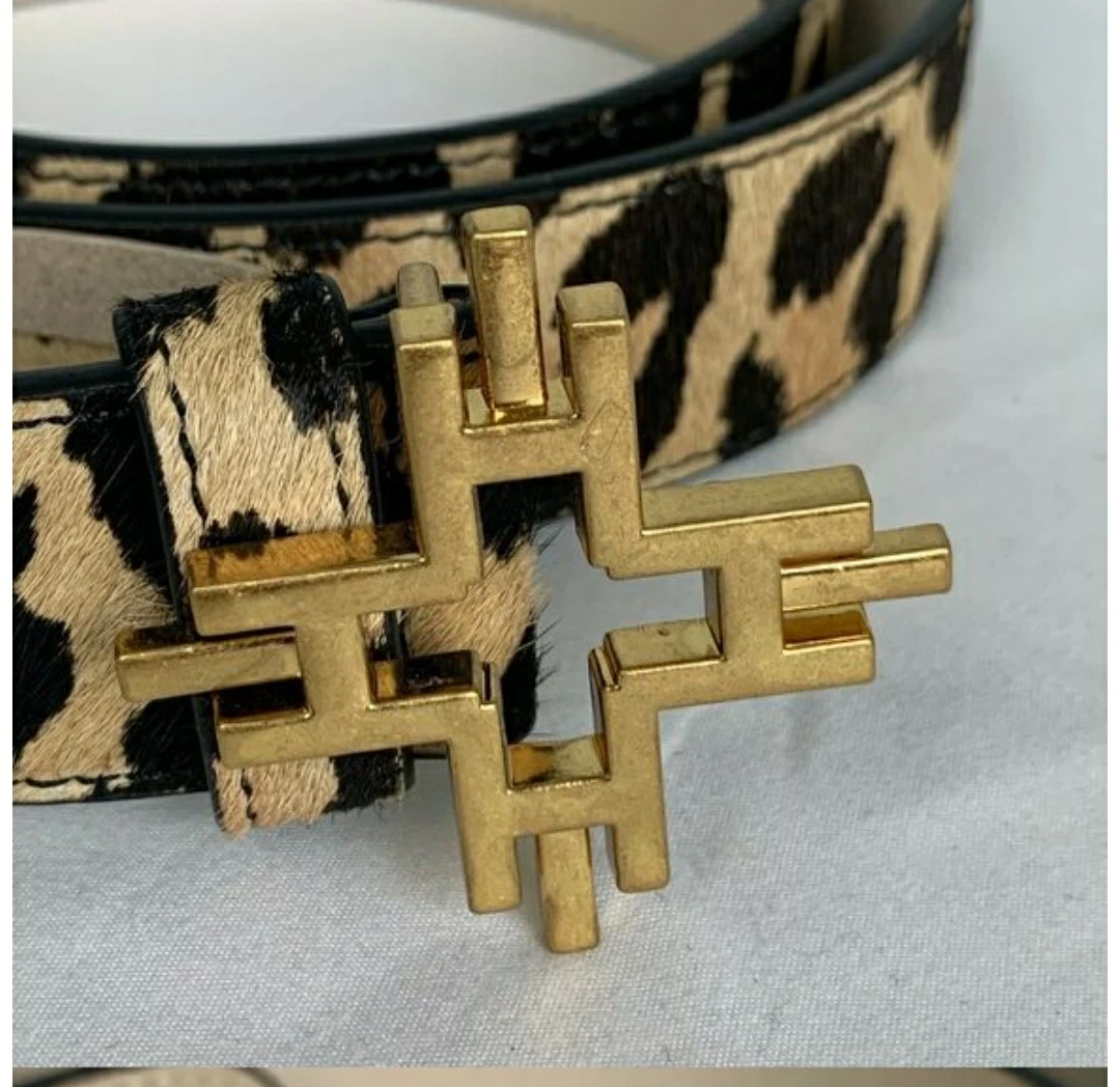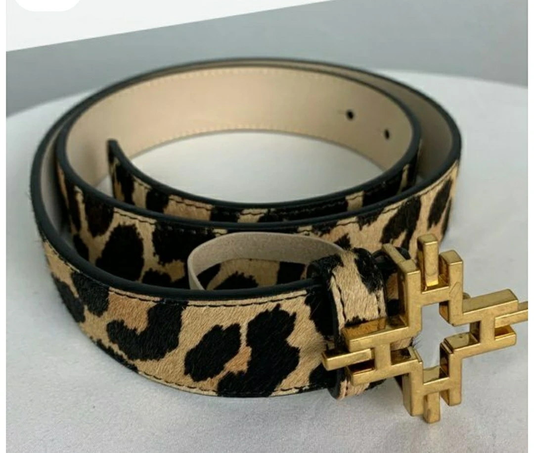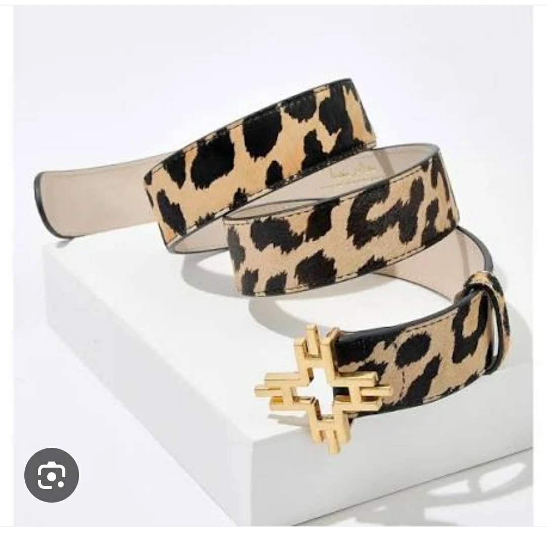 This stunning leopard belt from India Hicks features her signature geometric interlocking “H” buckle. Made from high-quality calf-hair on leather, it offers a smooth finish and multiple holes for size adjustment: