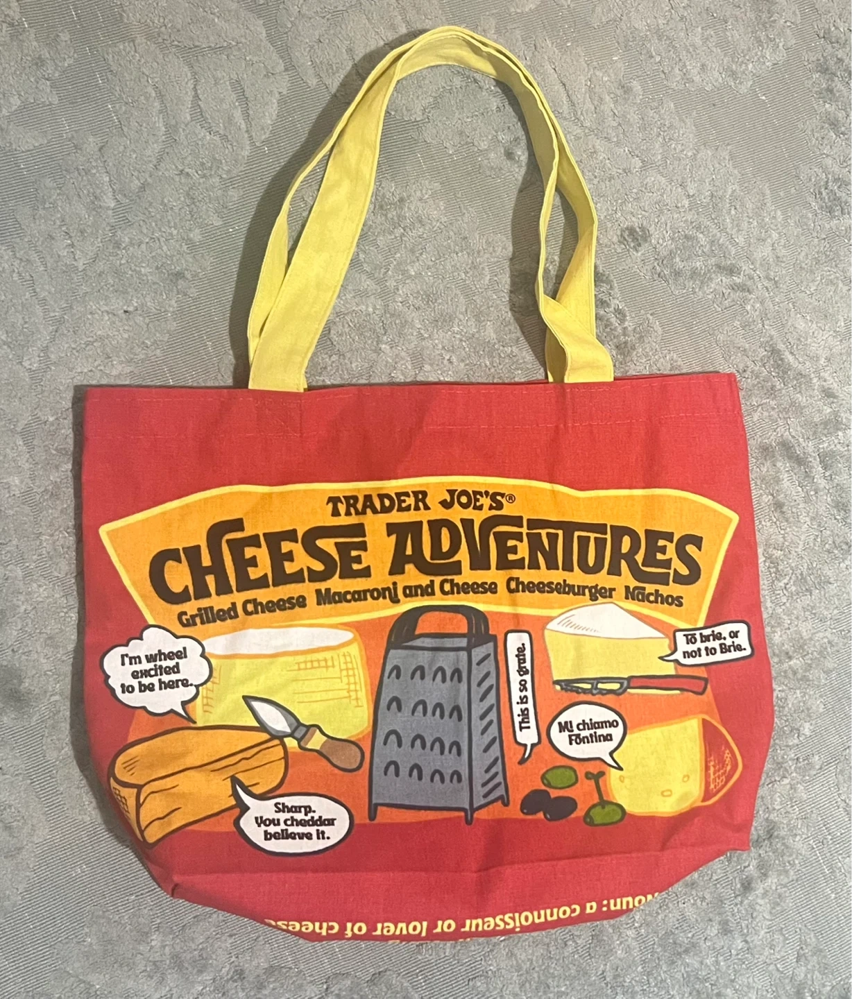 This is a Trader Joe's "Cheese Adventures" tote bag. It's made of red fabric with yellow handles. The bag features various cheese-themed graphics and text.