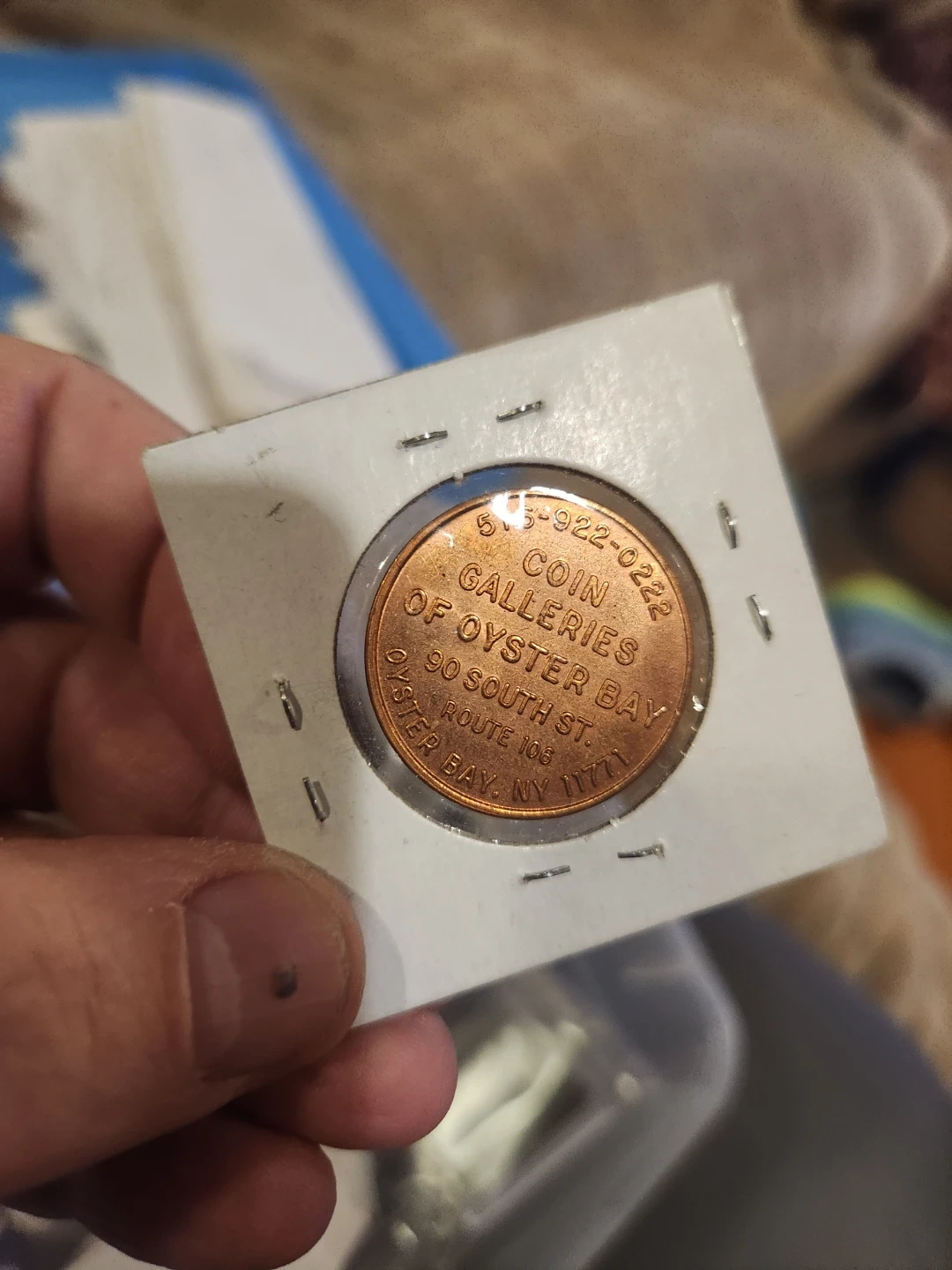 This is a token medallion from Coin Galleries of Oyster Bay. It's made of copper. The front shows a profile and text reading 'Industria, Liberty, Prudentia, Scientia'. The back lists the gallery's address and phone number.
