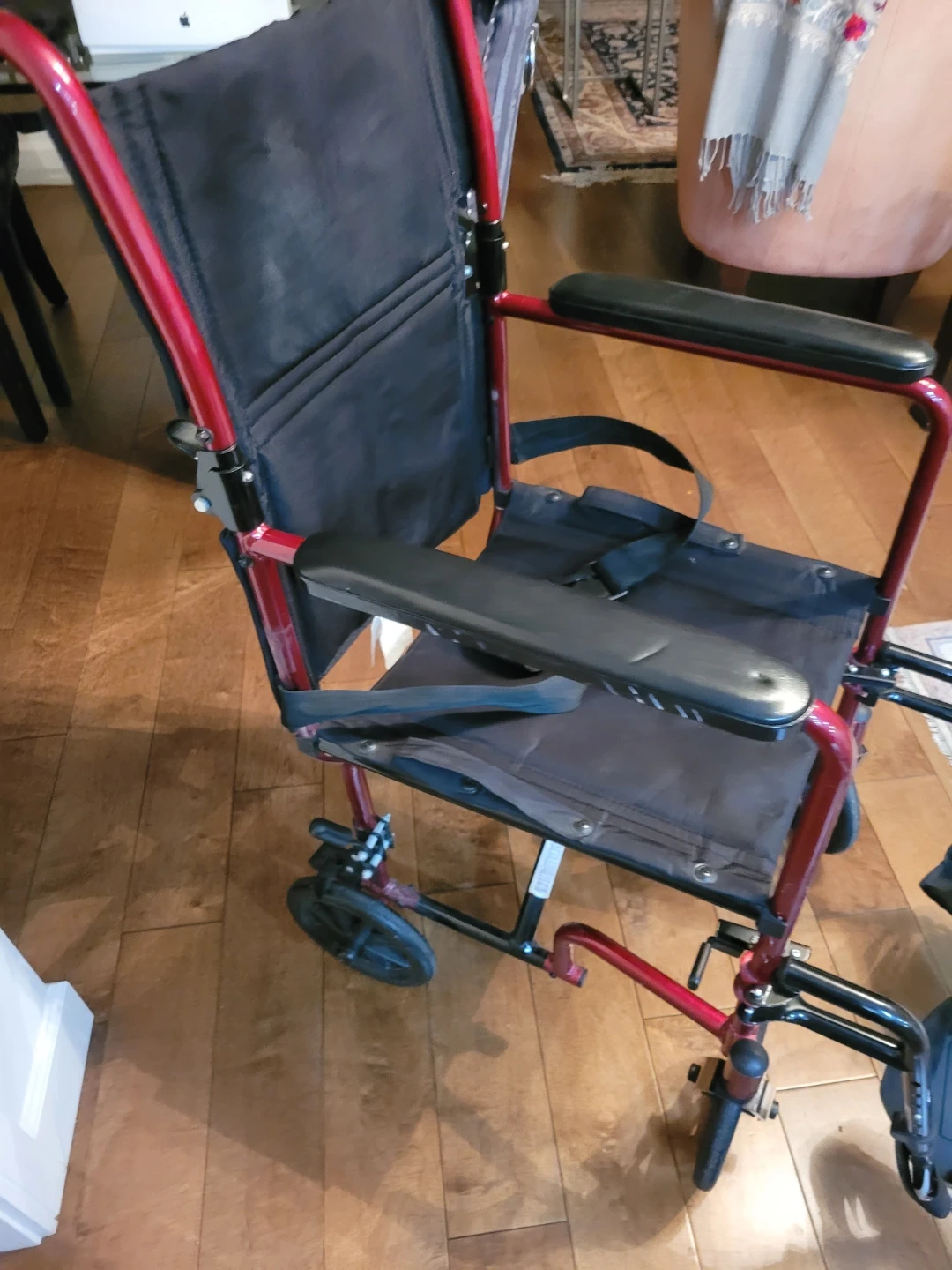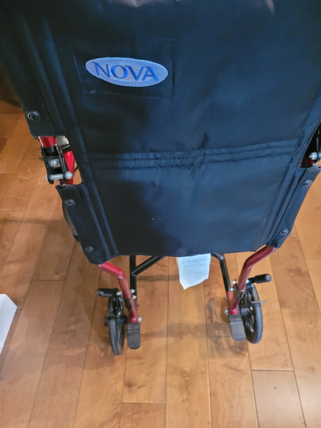 This is a Nova lightweight transport wheelchair. It's red and black with a seatbelt. The chair features padded armrests and footrests. It's foldable for easy transport.