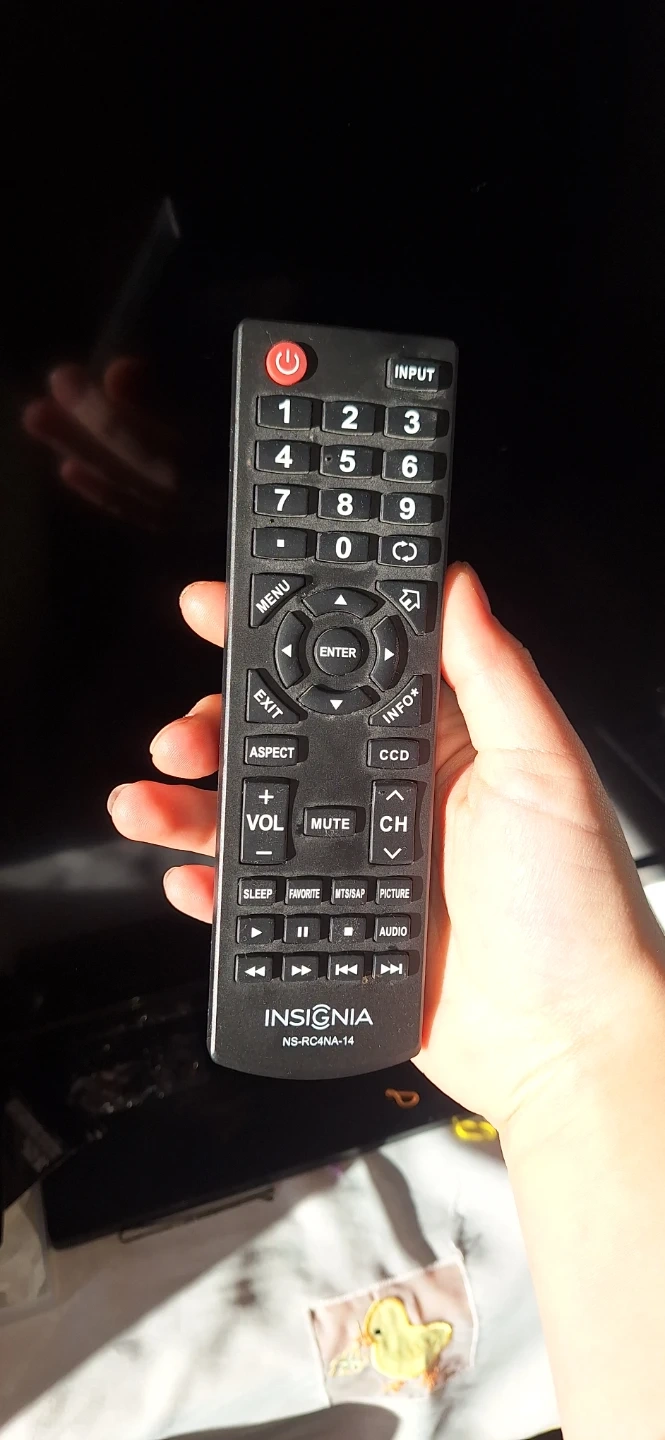 This is an Insignia TV remote, model NS-RC4NA-14. It's a standard remote with all the usual buttons for controlling your TV. It uses two AAA batteries, which are not included. 32 inches long.