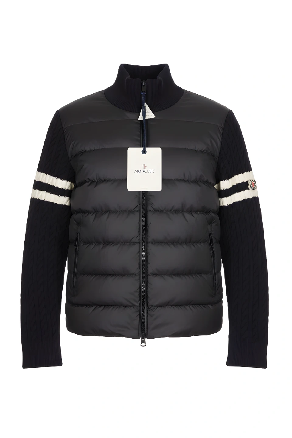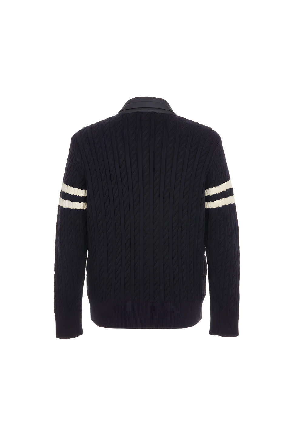 This Moncler jacket features a puffer front with cable knit sleeves & back. It has a full zip closure and a ribbed collar. White stripe details on the sleeves add a classic athletic touch.