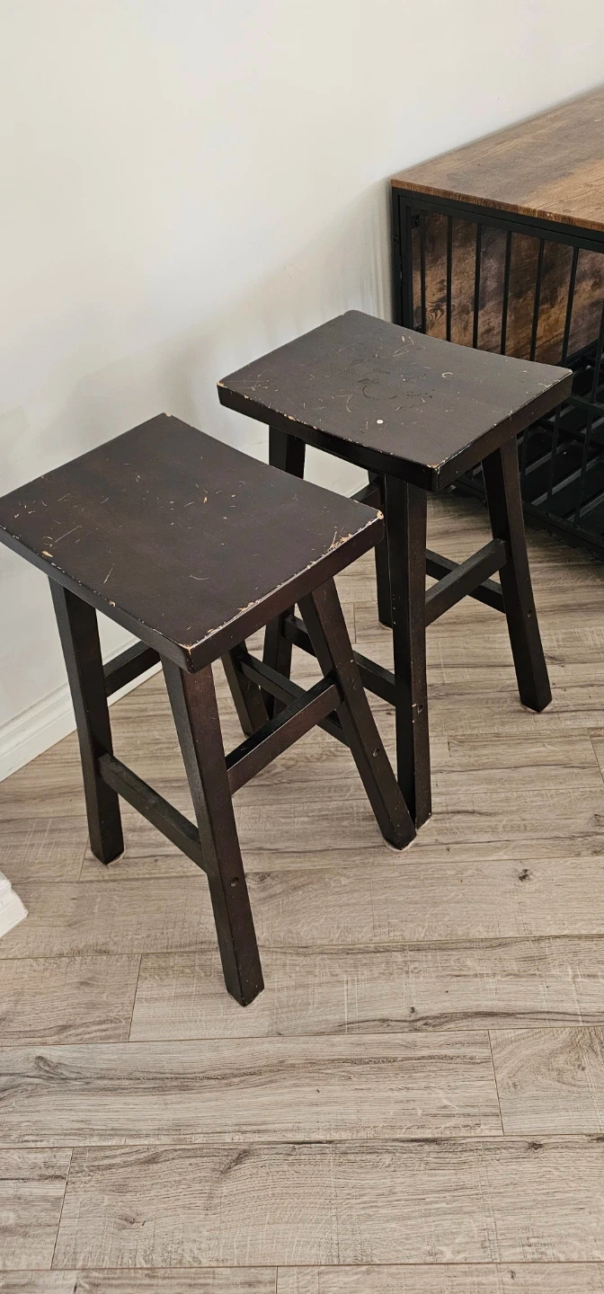 Selling a pair of dark brown wooden bar stools. These stools are sturdy and have a simple design. They're made of wood with a dark stain finish. Perfect for a kitchen island or bar area!
