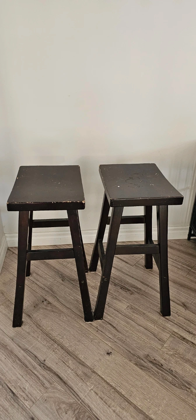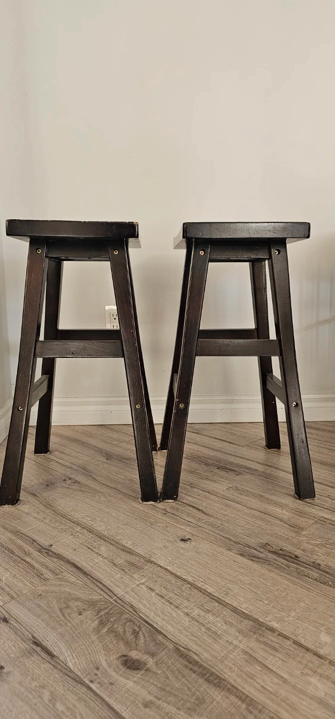 Selling a pair of dark brown wooden bar stools. These stools are sturdy and have a simple design. They're made of wood with a dark stain finish. Perfect for a kitchen island or bar area!