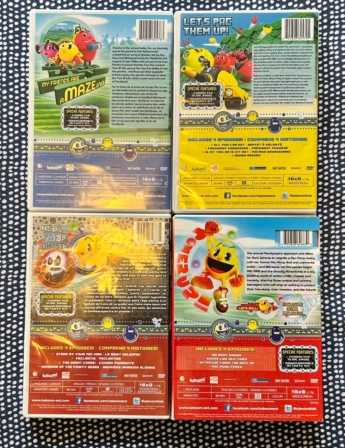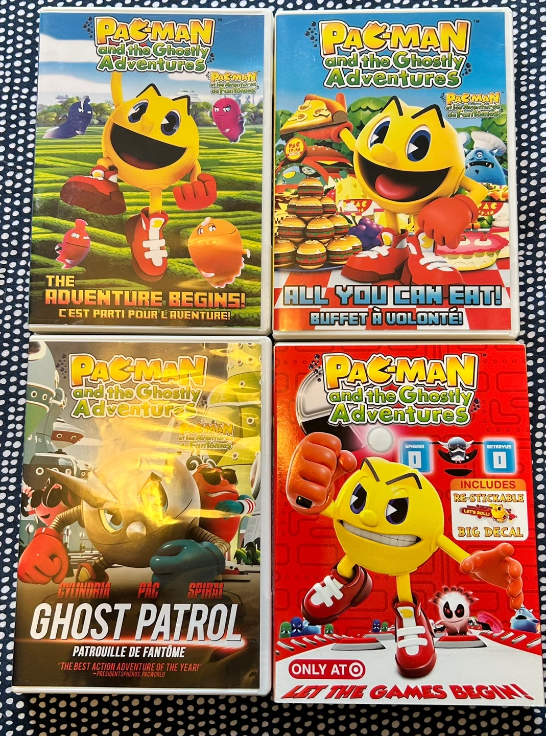 Four DVDs featuring Pac-Man and the Ghostly Adventures. Includes episodes: Ghost Patrol, All You Can Eat, The Adventure Begins, and Let the Games Begin. $20 for all four DVDs 😊