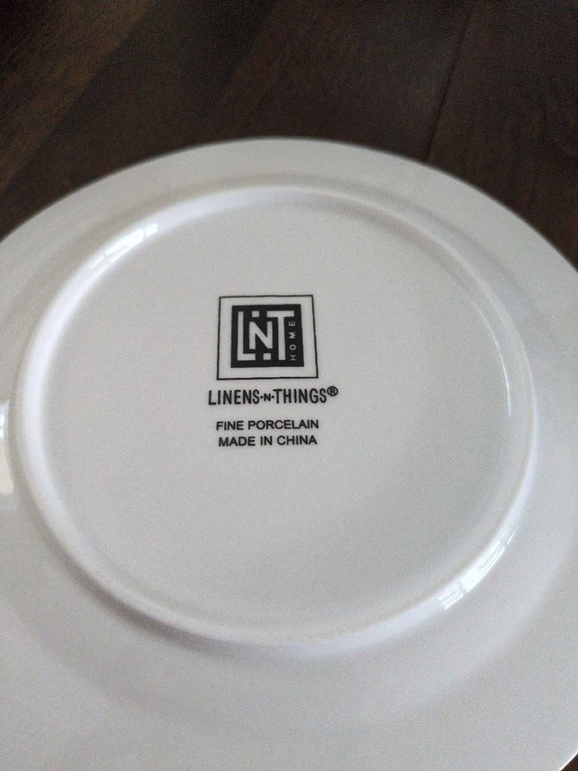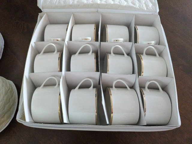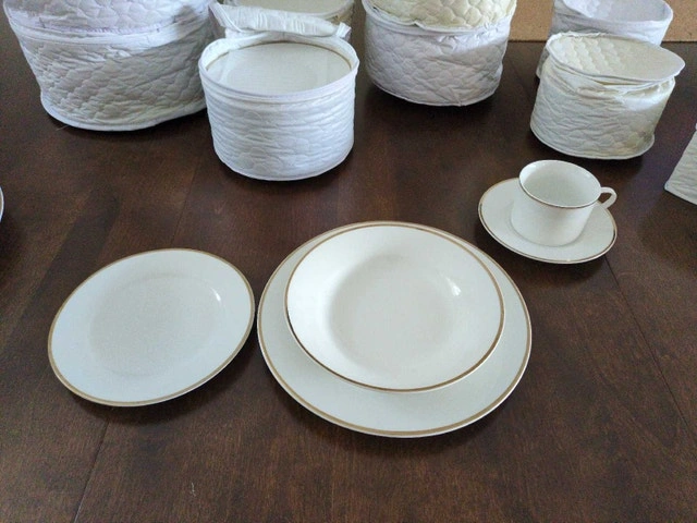 Includes dinner plate, bowl, dessert plate, small plate/saucer for each setting, plus 12 cups, 3 large serving plates, and 3 large serving bowls. Gold rimmed - ideal for sprucing up your dinner parties. Must go.