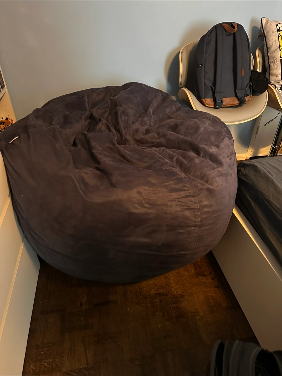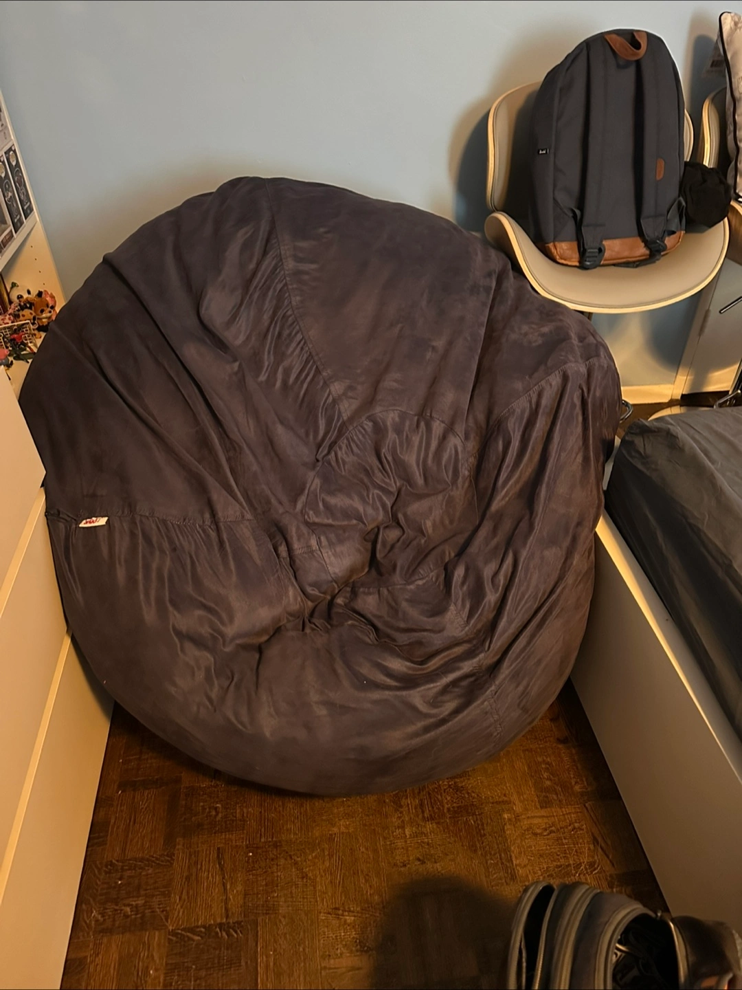 Big, dark-blue beanbag chair. Soft, plush material. Great for lounging and relaxing. Good condition.