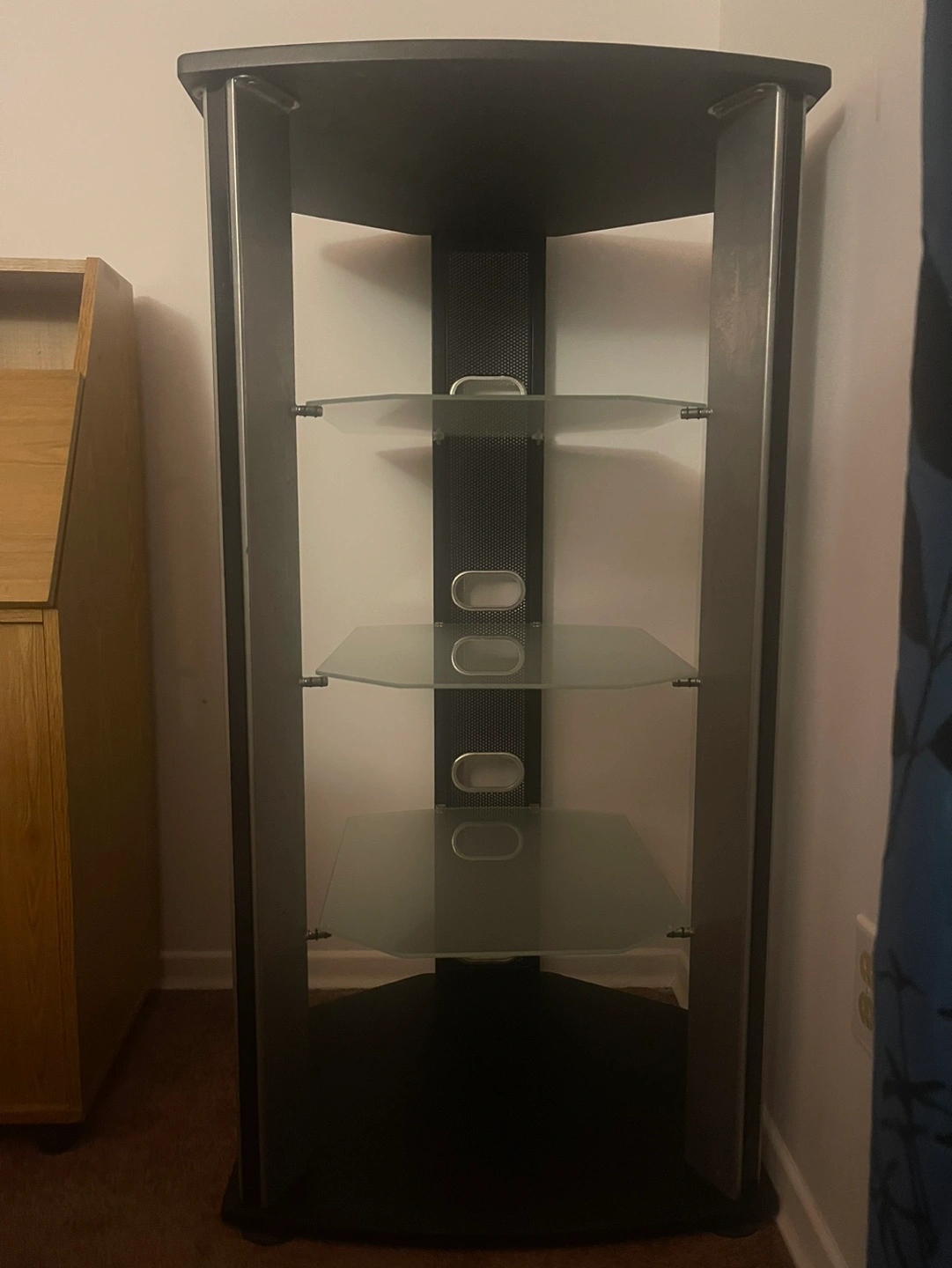 Corner entertainment stand with 3 frosted glass shelves. Black with silver accents.