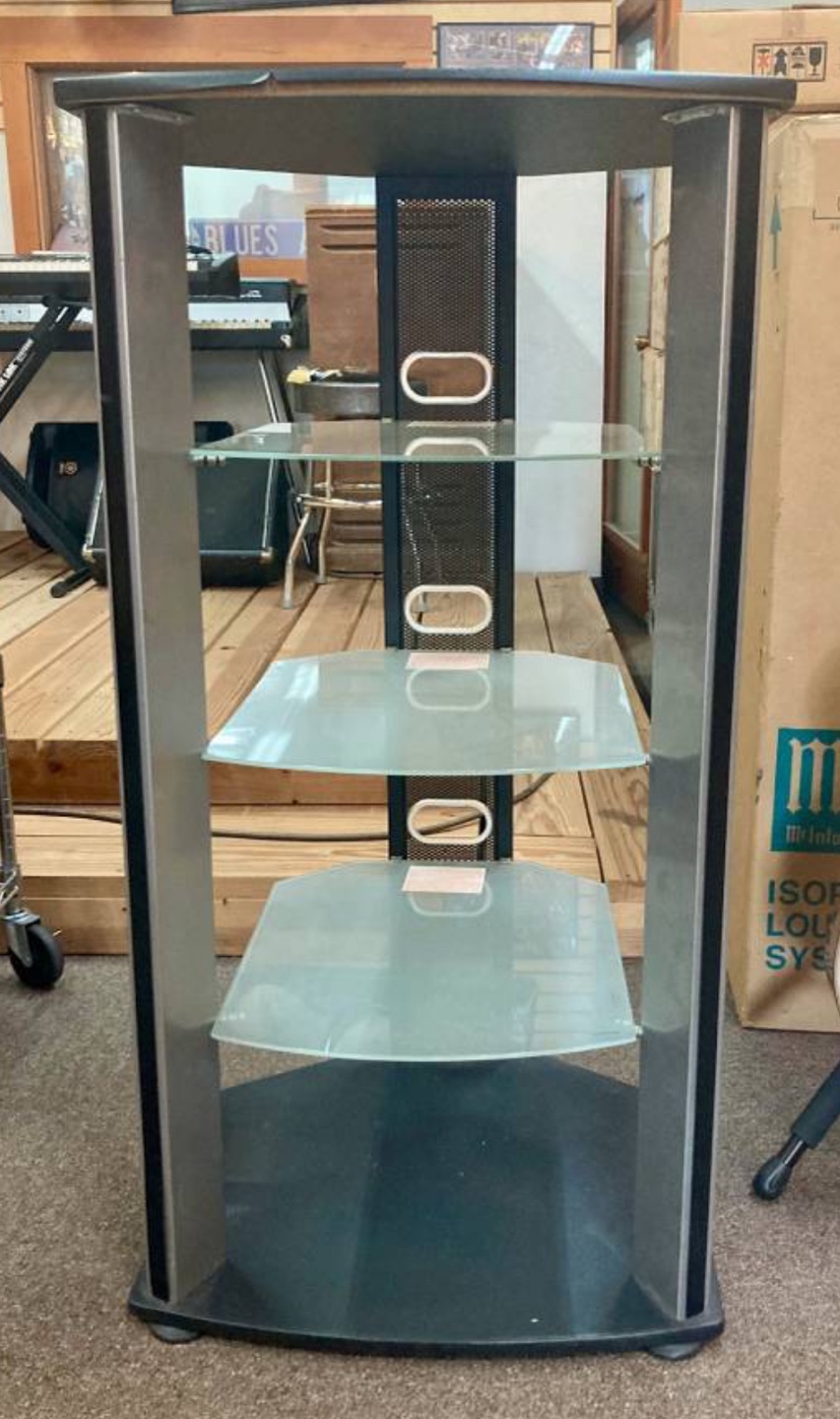 Corner entertainment stand with 3 frosted glass shelves. Black with silver accents.