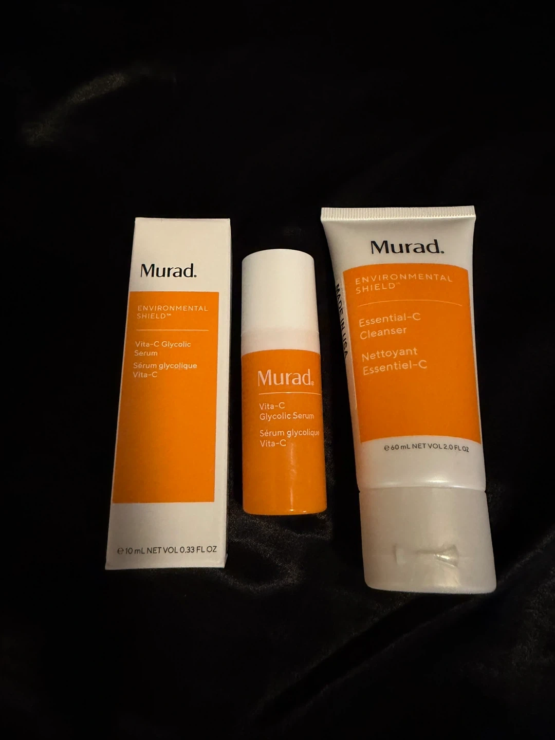 This set includes Murad Vita-C Glycolic Serum and Essential-C Cleanser. The serum is 10 mL (0.33 FL OZ) and the cleanser is 60 mL (2.0 FL OZ). Both are from the Environmental Shield line.