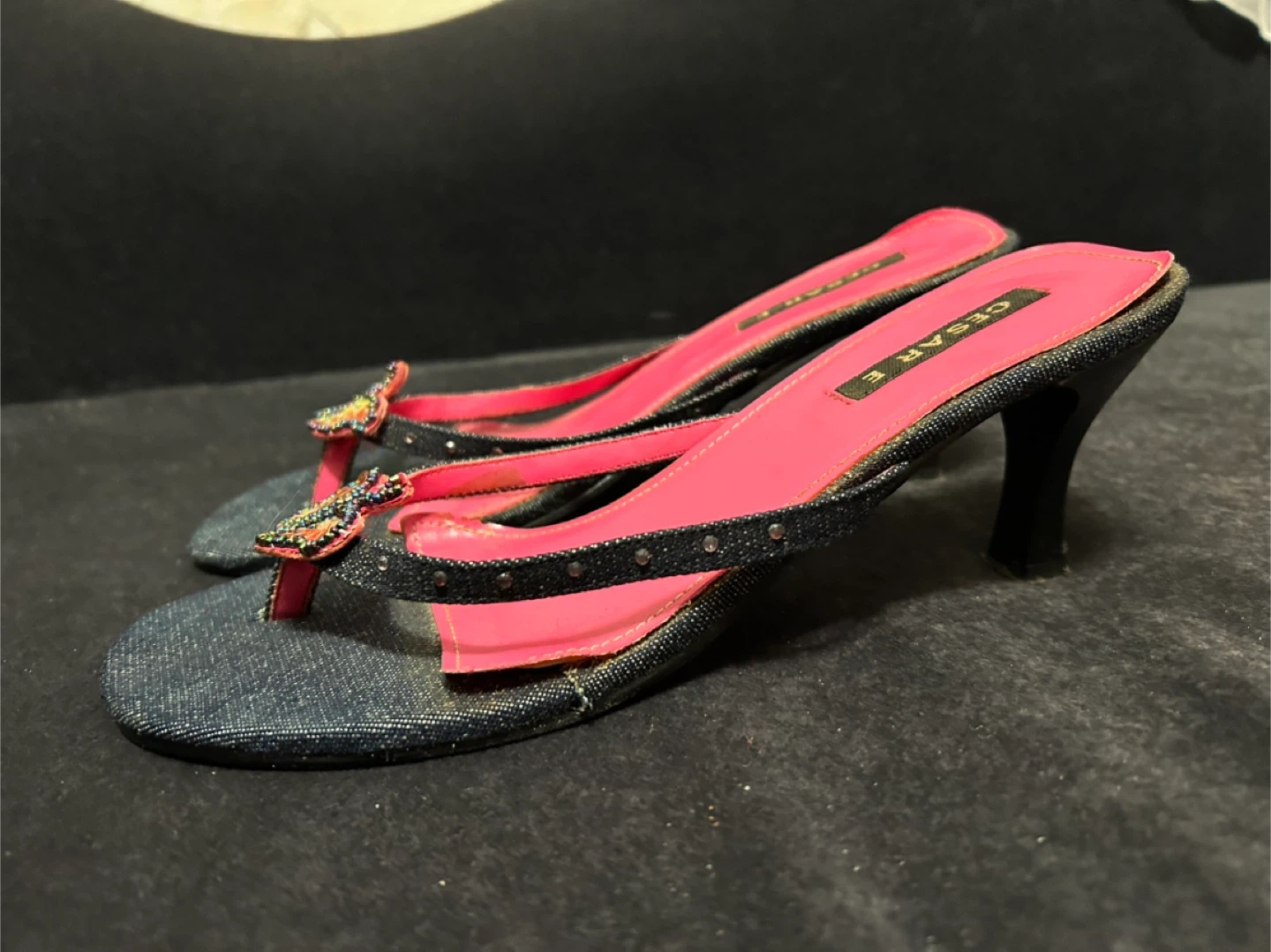Denim sandals feature a fun butterfly design with sequins and beads. They have a denim exterior and a bright pink interior. A stylish choice for any outfit!