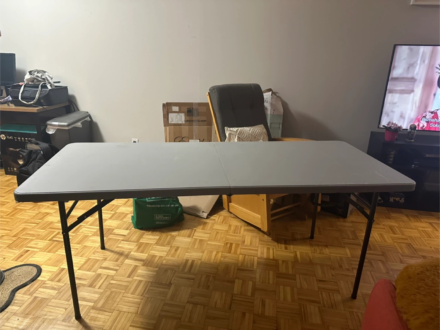 Selling a grey folding table. It's in good condition and perfect for extra space when you need it! It's easy to fold up and store when not in use, making it super convenient for small spaces or occasional use. It has wears and tears but still useful for unexpected moments