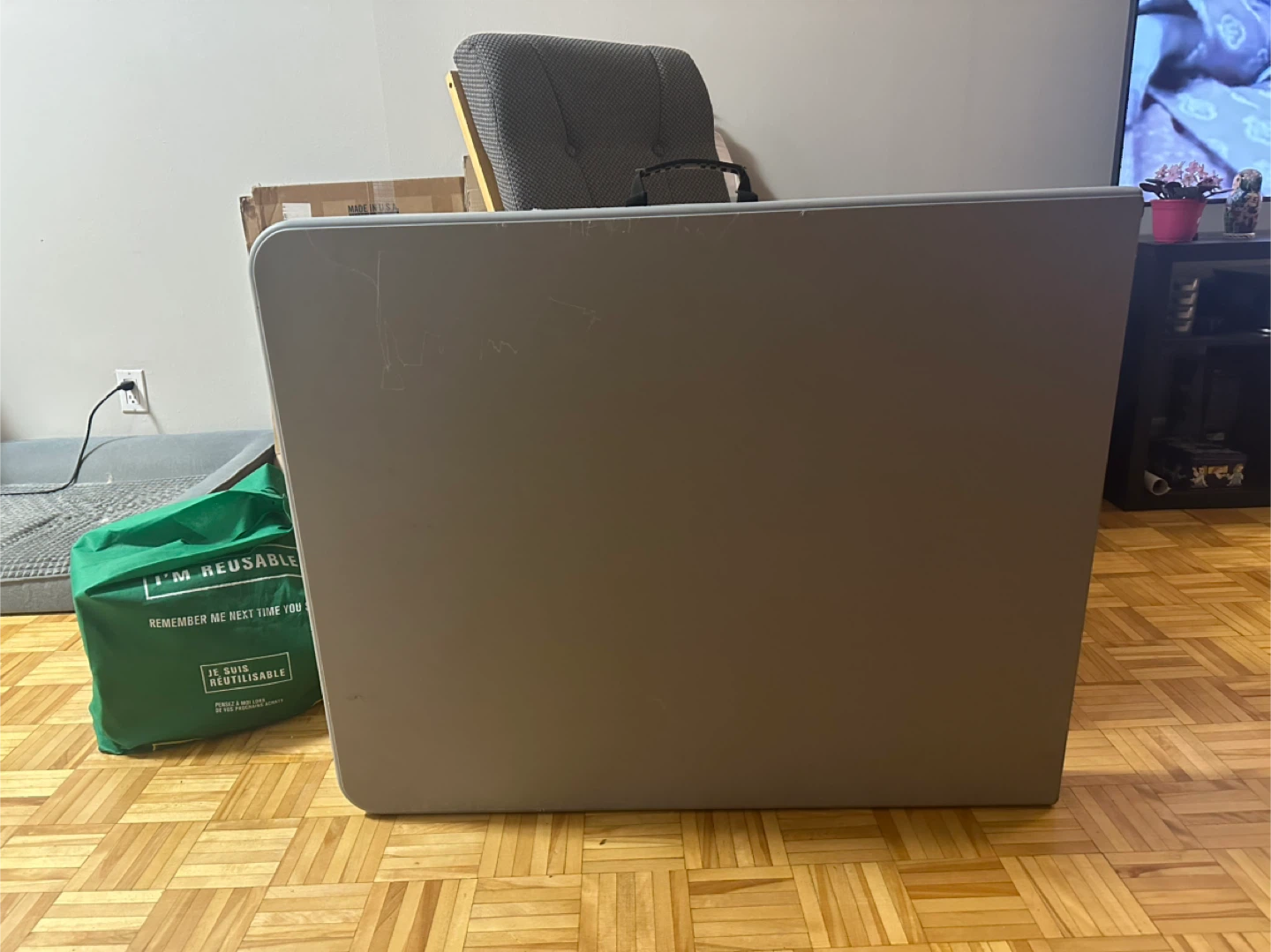 Selling a grey folding table. It's in good condition and perfect for extra space when you need it! It's easy to fold up and store when not in use, making it super convenient for small spaces or occasional use. It has wears and tears but still useful for unexpected moments
