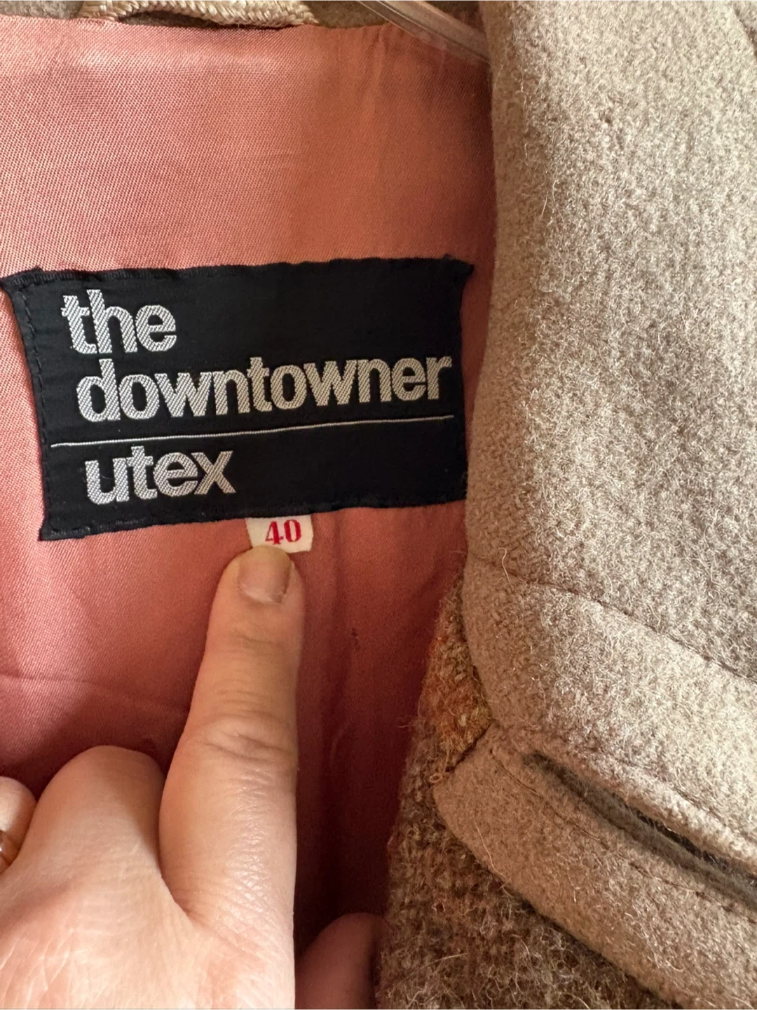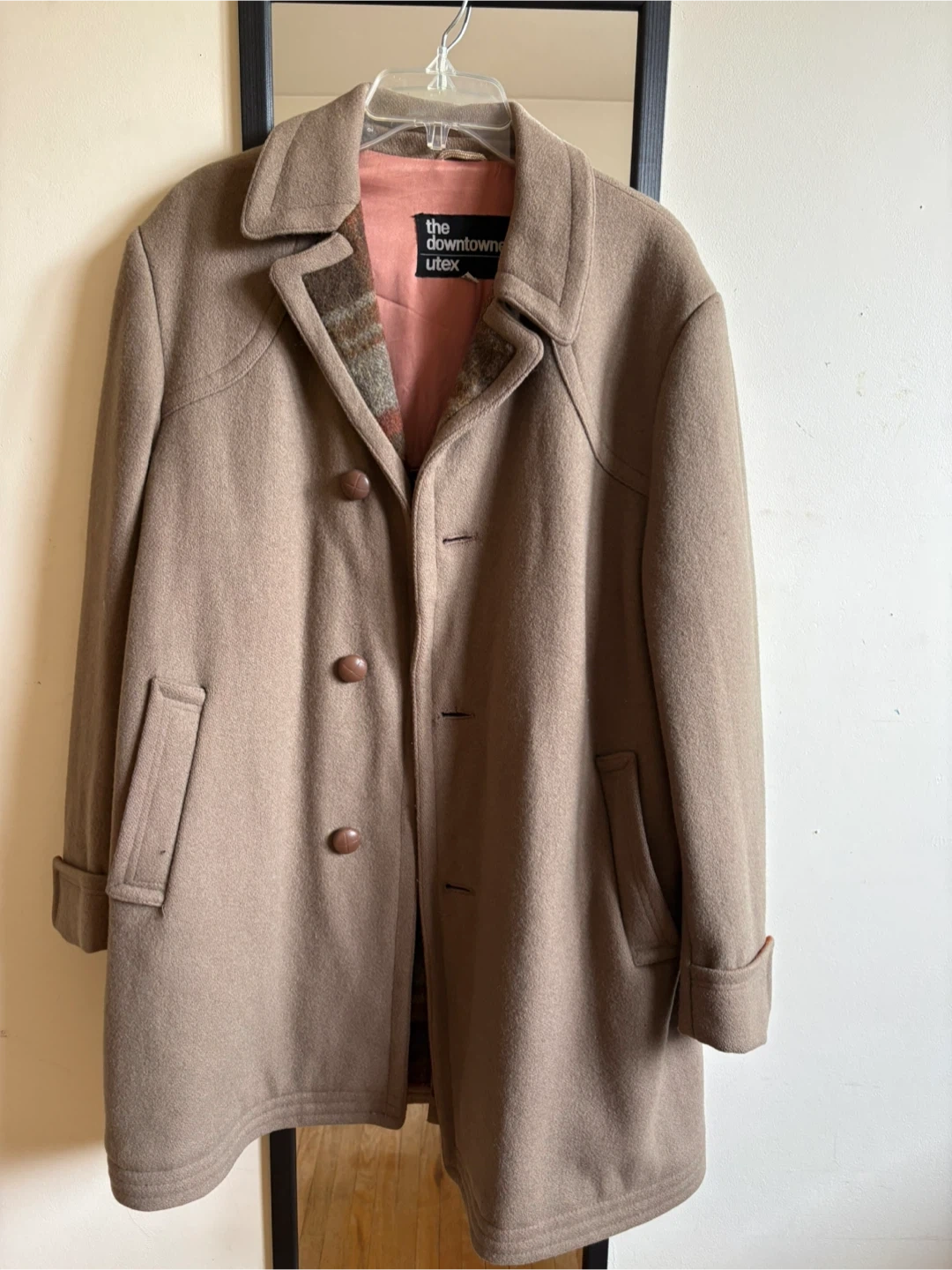 Classic tan wool blend coat from The Downtowner. Features a pink satin lining and a colourful plaid interior. Size 40.