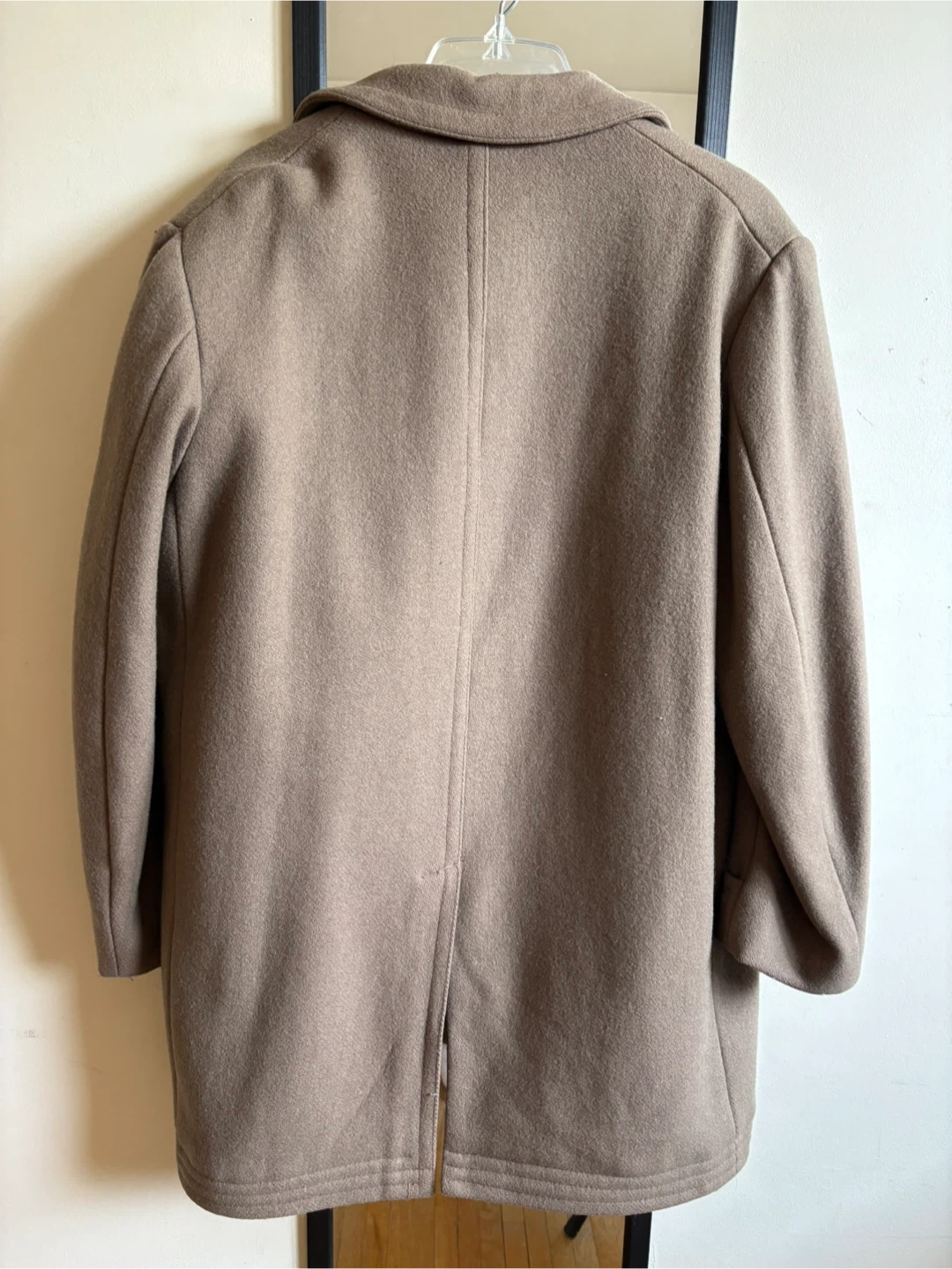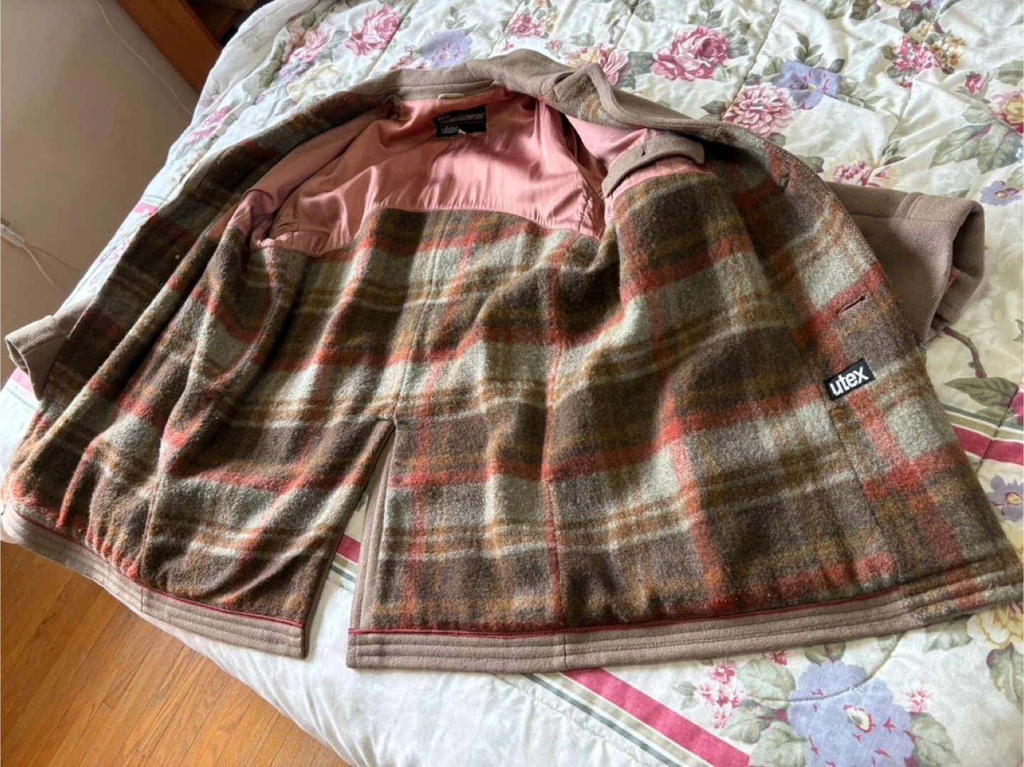 Classic tan wool blend coat from The Downtowner. Features a pink satin lining and a colourful plaid interior. Size 40.