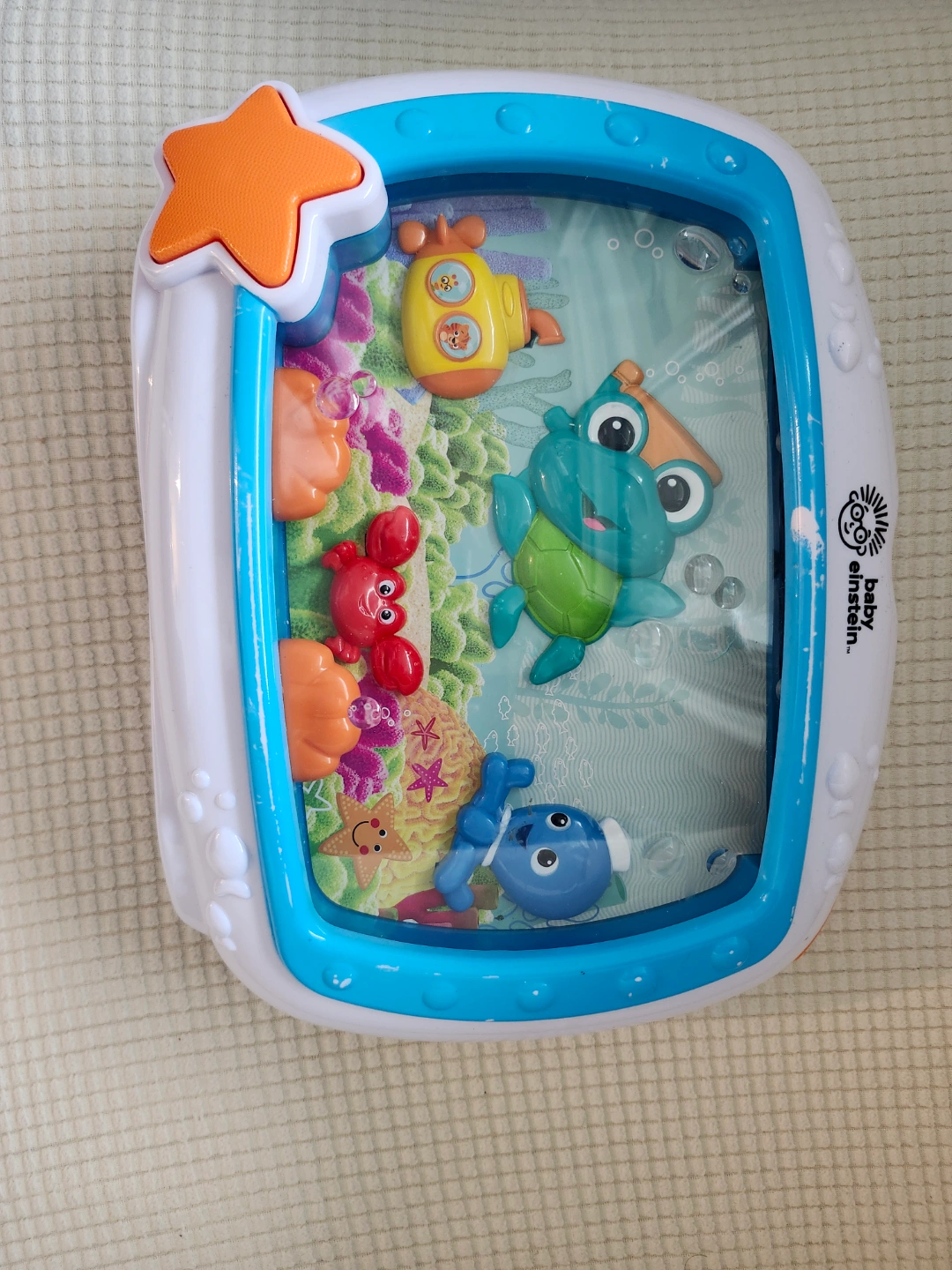Pre-loved Baby Einstein musical toy. Features ocean scene with lights and sounds. Great for babies and toddlers. Portable and easy to use.