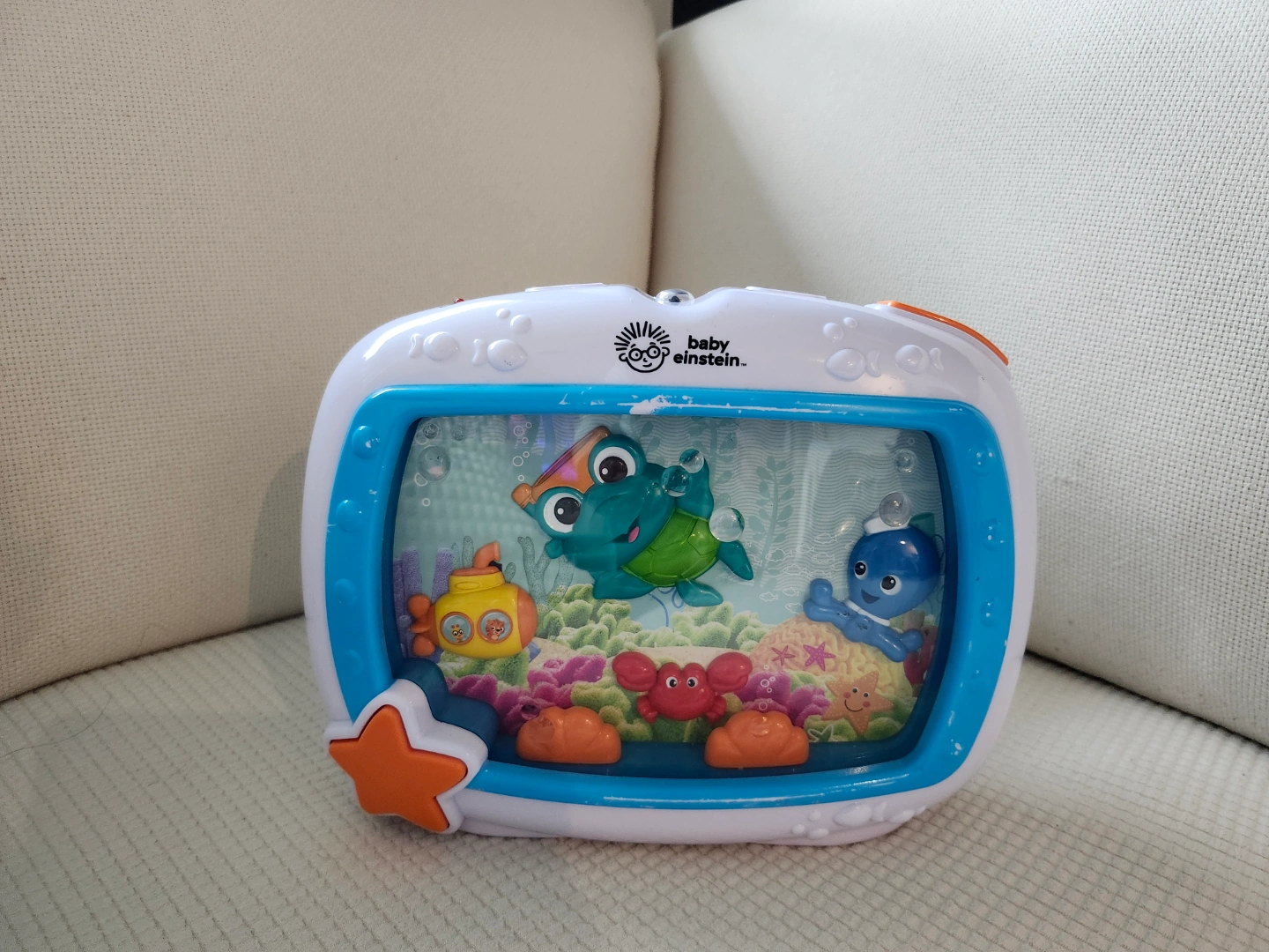 Pre-loved Baby Einstein musical toy. Features ocean scene with lights and sounds. Great for babies and toddlers. Portable and easy to use.
