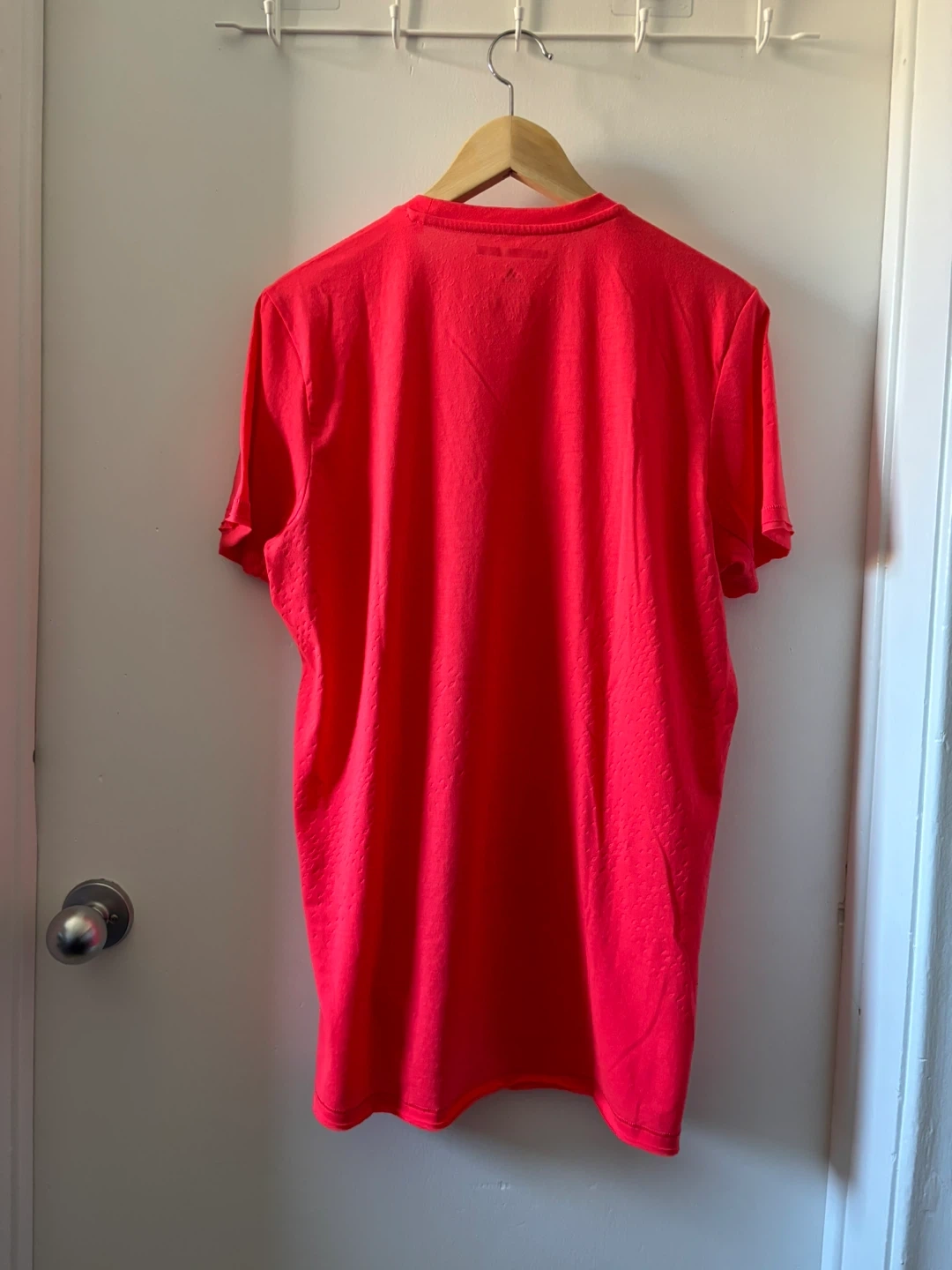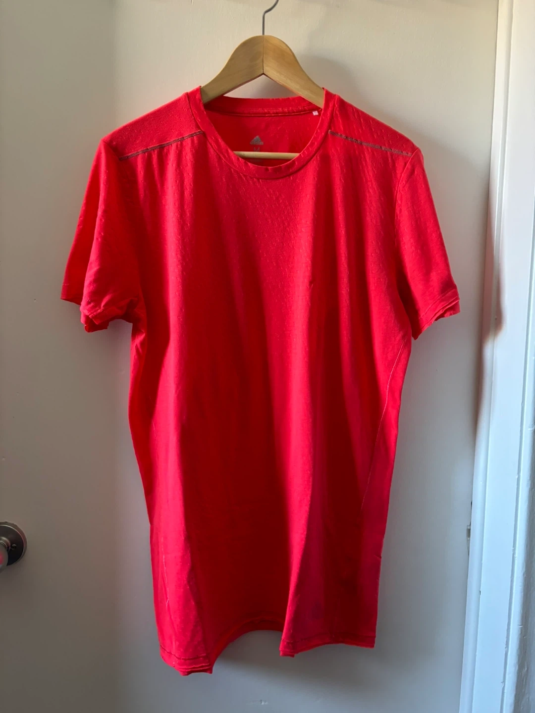 Adidas men's short-sleeve running t-shirt. Vibrant red colour and lightweight, breathable fabric designed for athletic performance. A great shirt for your next workout or run! Size medium.