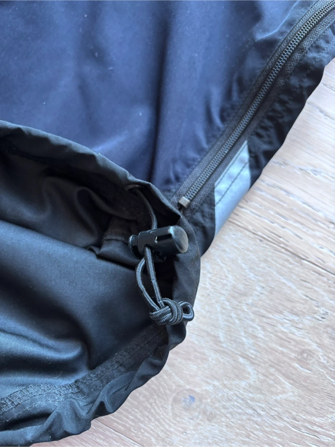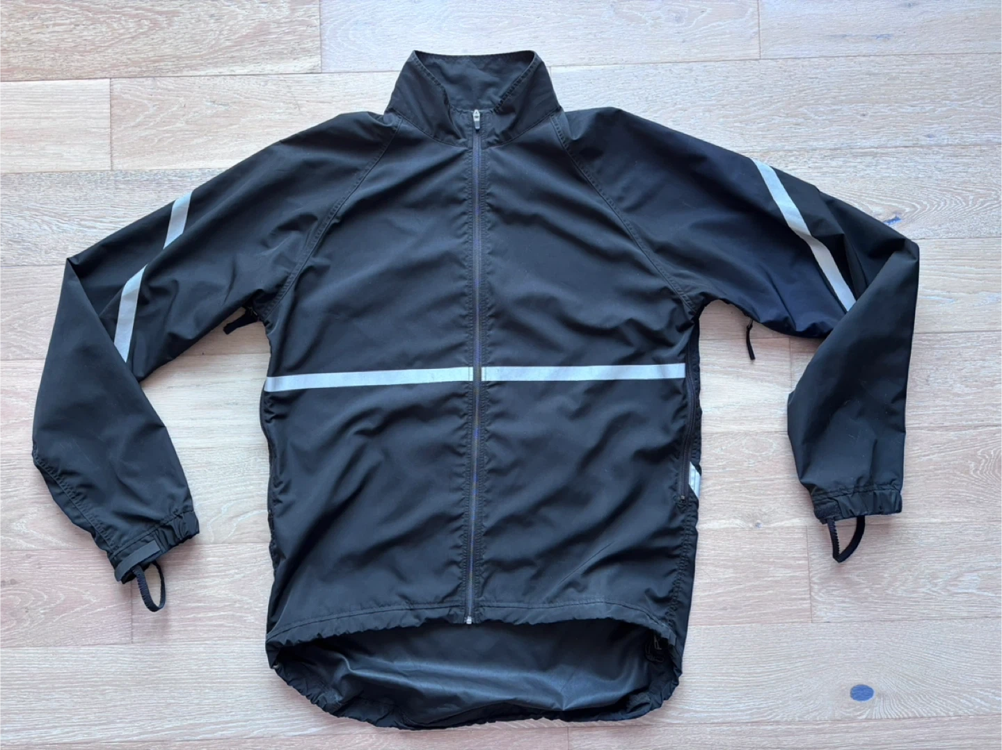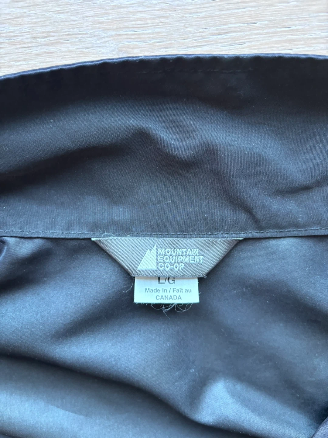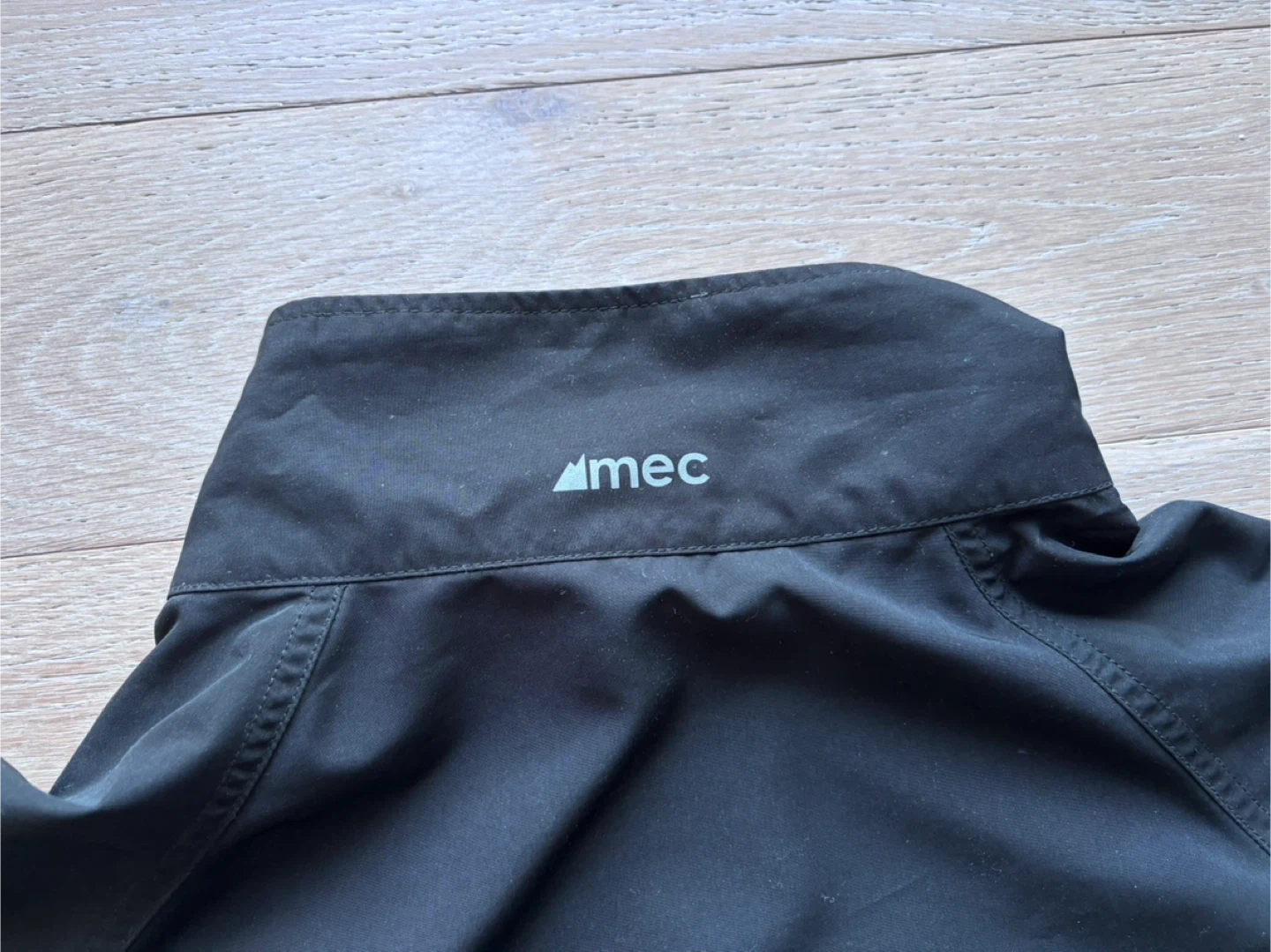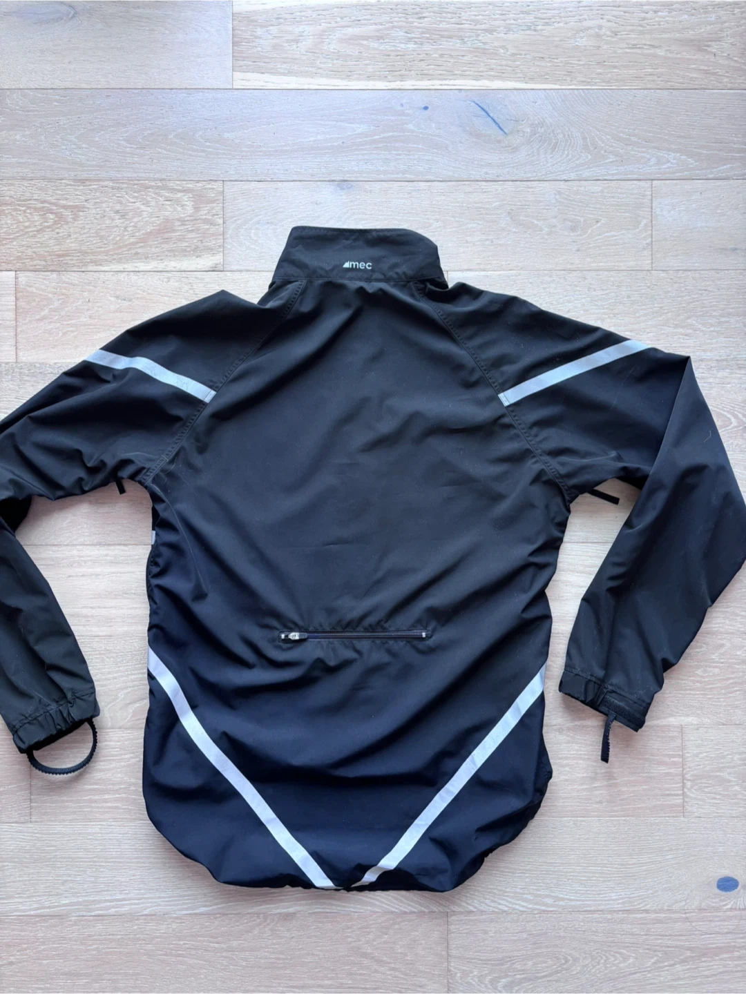 Large MEC jacket, tailored cut that fits over layers but doesn't billow in the wind when you're riding.
