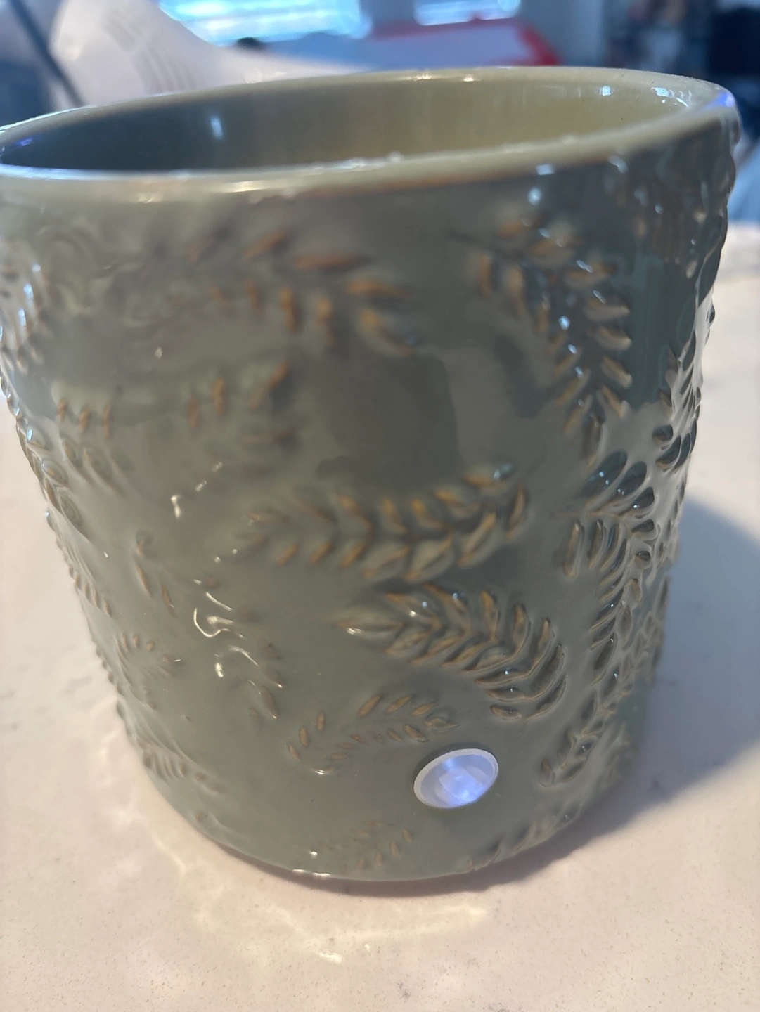 Electric wax warmer, sage green colour. Features embossed leaf pattern. Includes power cord. Warmer plate is broken, needs a replacement. Otherwise works good.