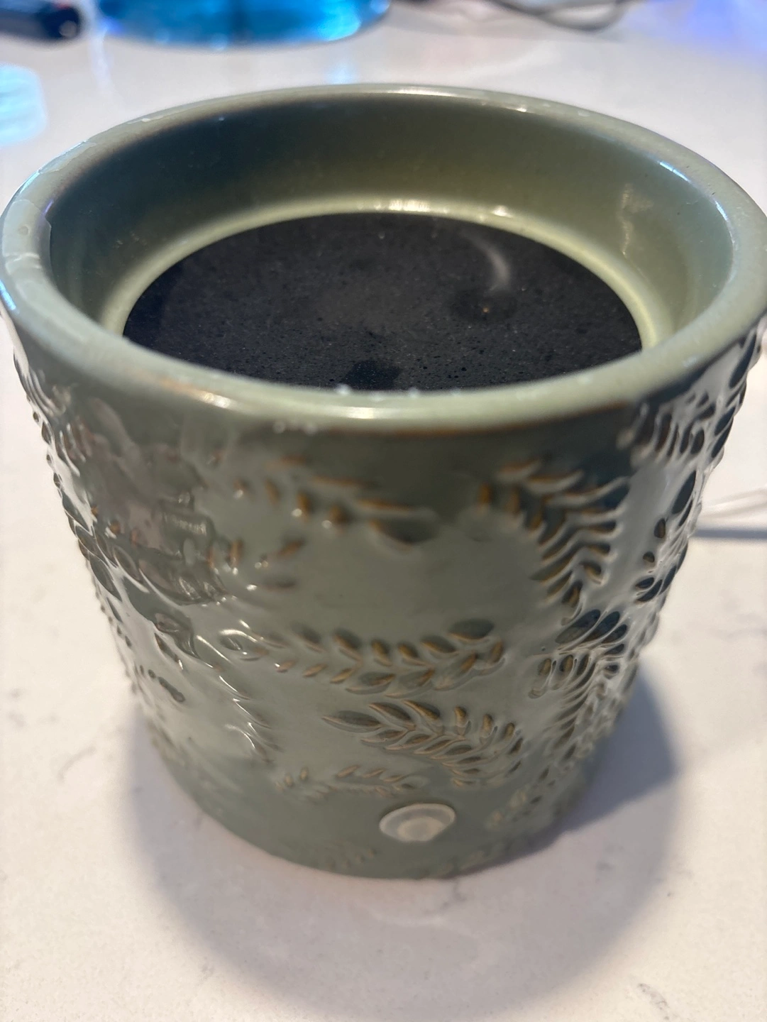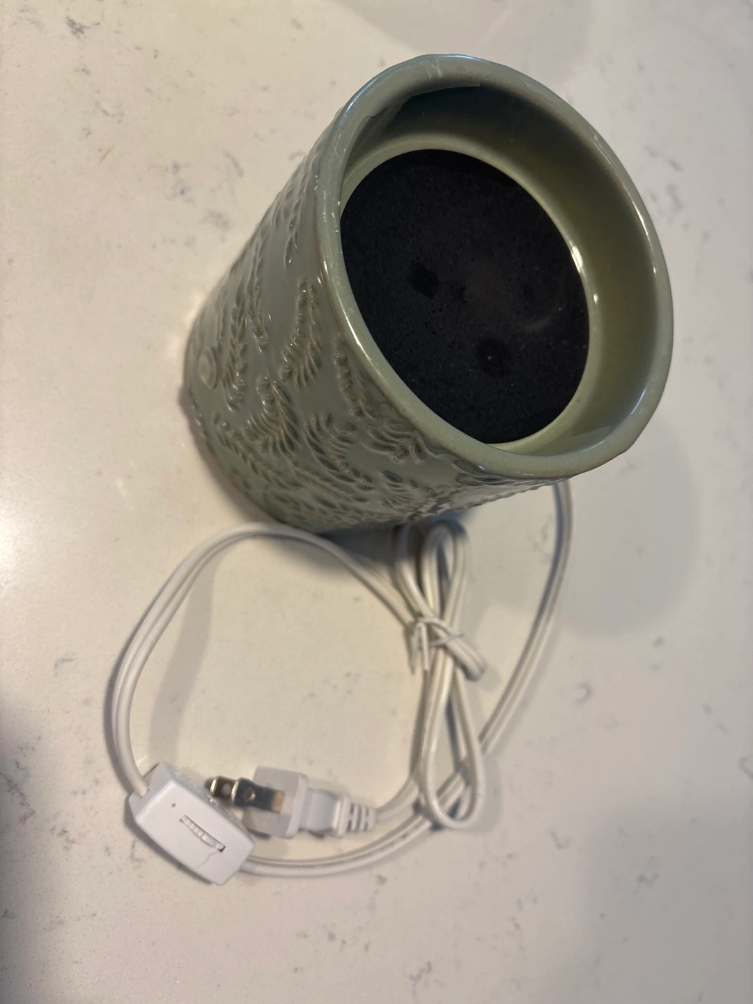 Electric wax warmer, sage green colour. Features embossed leaf pattern. Includes power cord. Warmer plate is broken, needs a replacement. Otherwise works good.