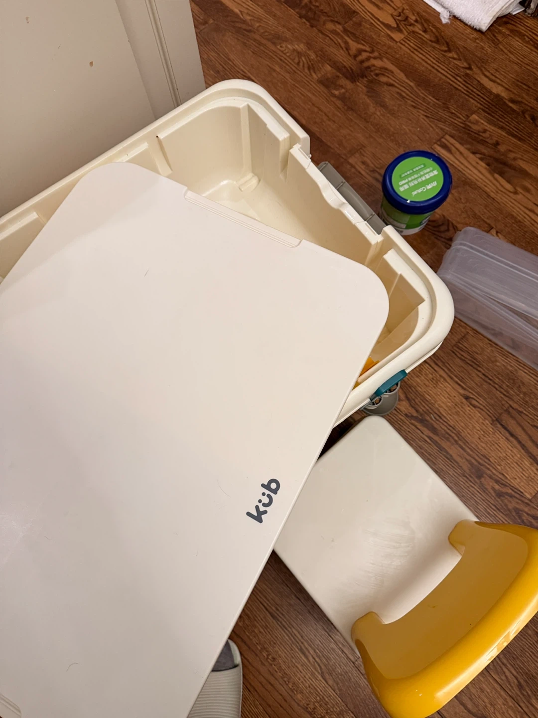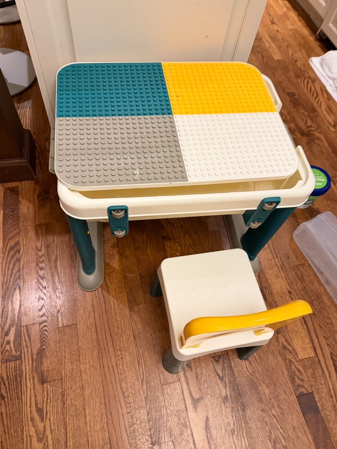 This is a building block activity table and chair set from Küb. It includes a table with a buildable surface and a matching chair. The table has a built-in storage bin for blocks and toys. It's designed for creative play and building fun!