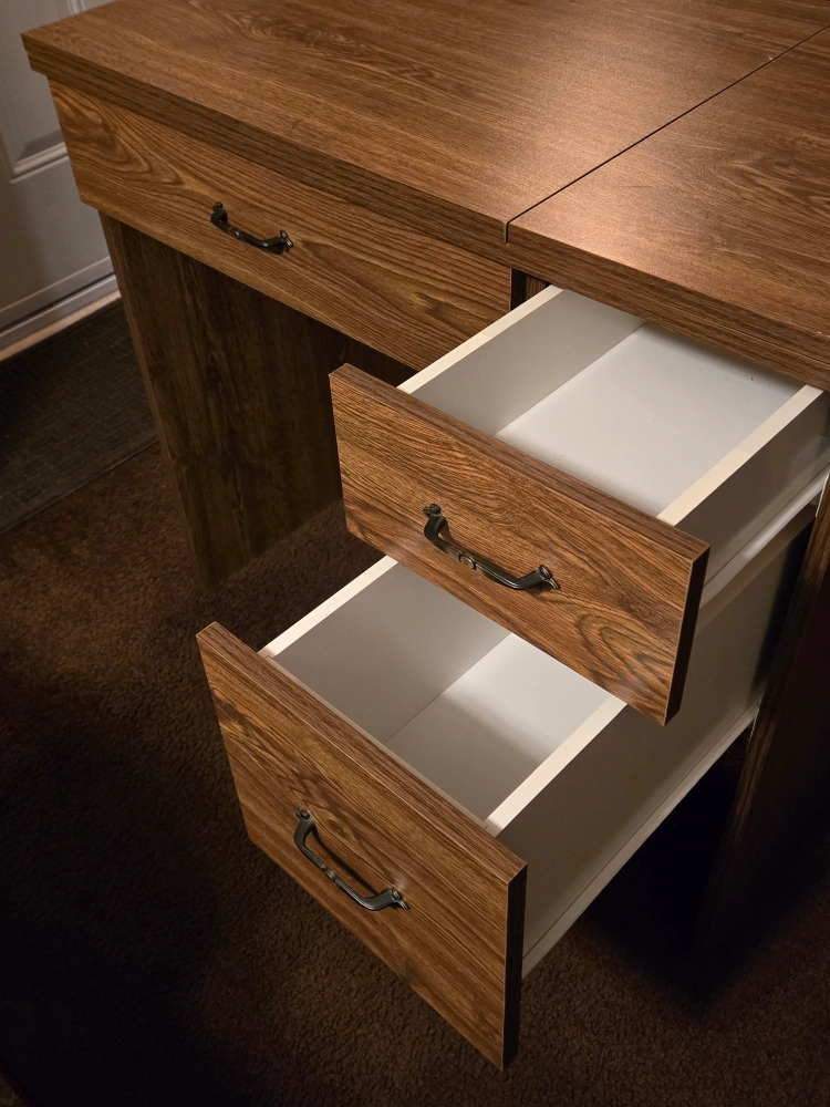 Functional sewing table. Features a drop-leaf design, two drawers for storage, and a built-in compartment for a sewing machine. Dark brown woodgrain finish. Great for crafting or sewing projects.