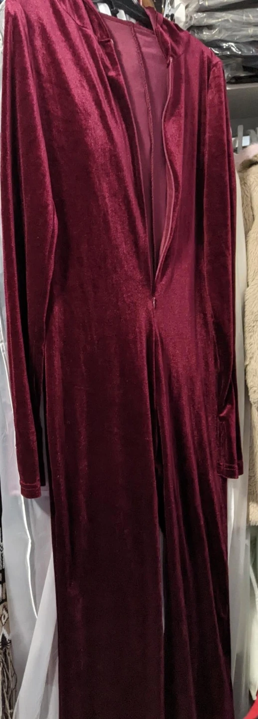 This burgundy velvet hooded jumpsuit has a zipper closure down the front. It's made of a soft velvet material. It's a comfortable one-piece outfit.