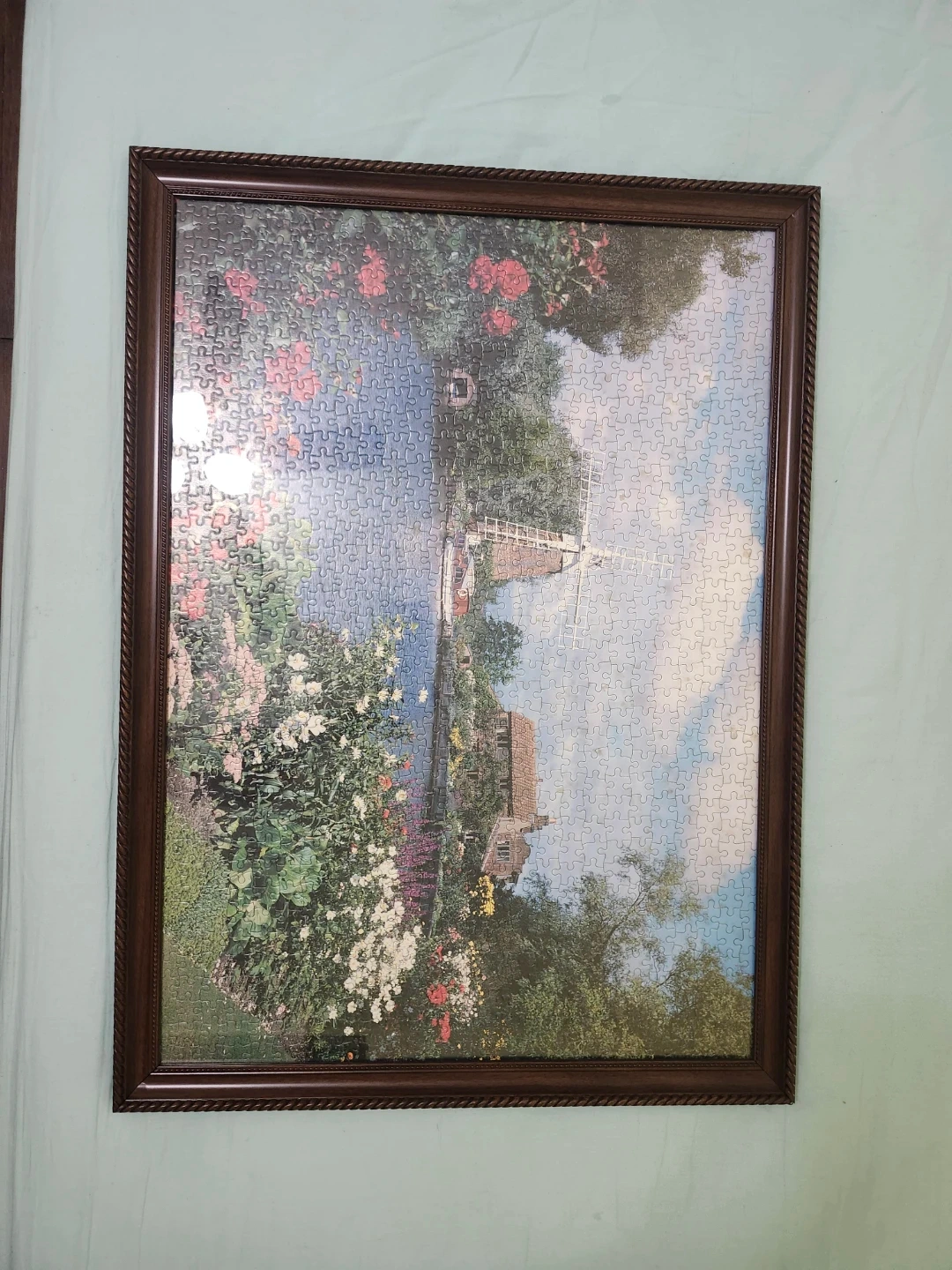 Beautifully completed 1000-piece jigsaw puzzle featuring a serene landscape of a windmill and a lush flower garden.
