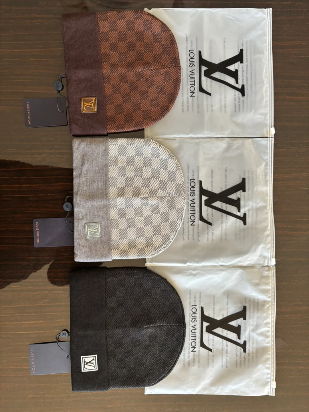Set of three Louis Vuitton beanies. Includes dust bags for each hat. Various patterns and colours available. ( 35$ ) price negotiable