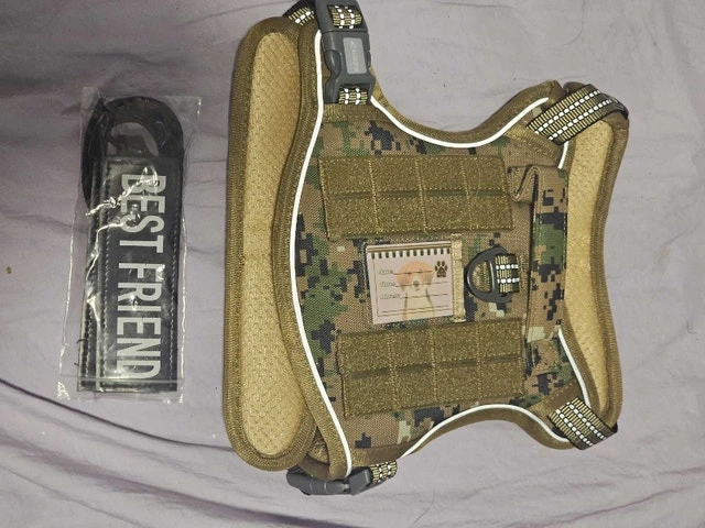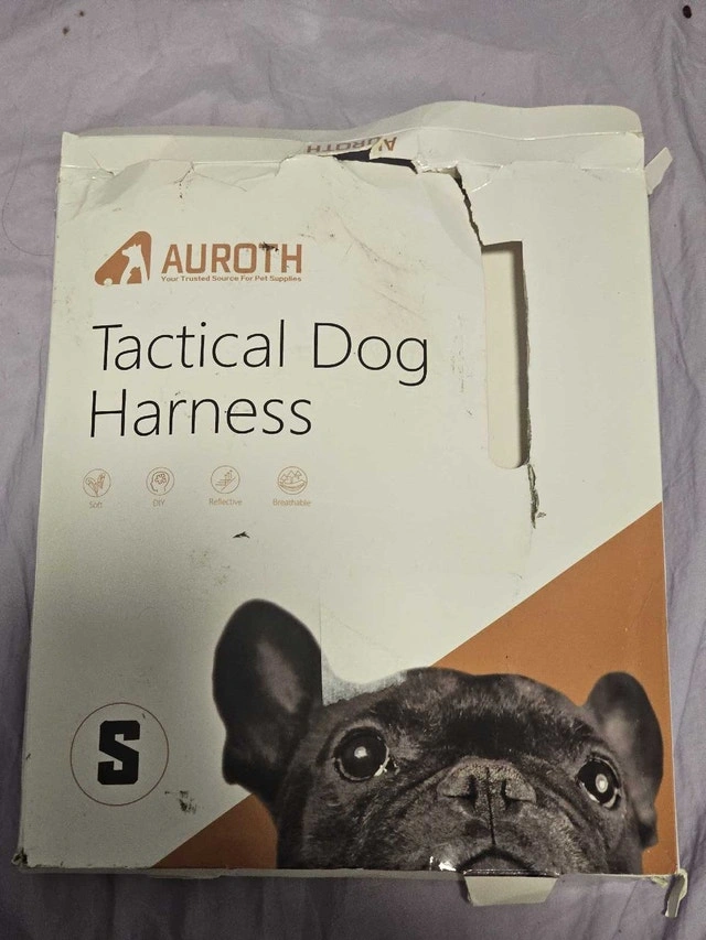 Keep your furry friend geared up with this Auroth tactical dog harness, size small! This robust harness is crafted for comfort and durability, perfect for outdoor adventures. Although the box shows some wear, the harness itself is in excellent condition and ready for action.