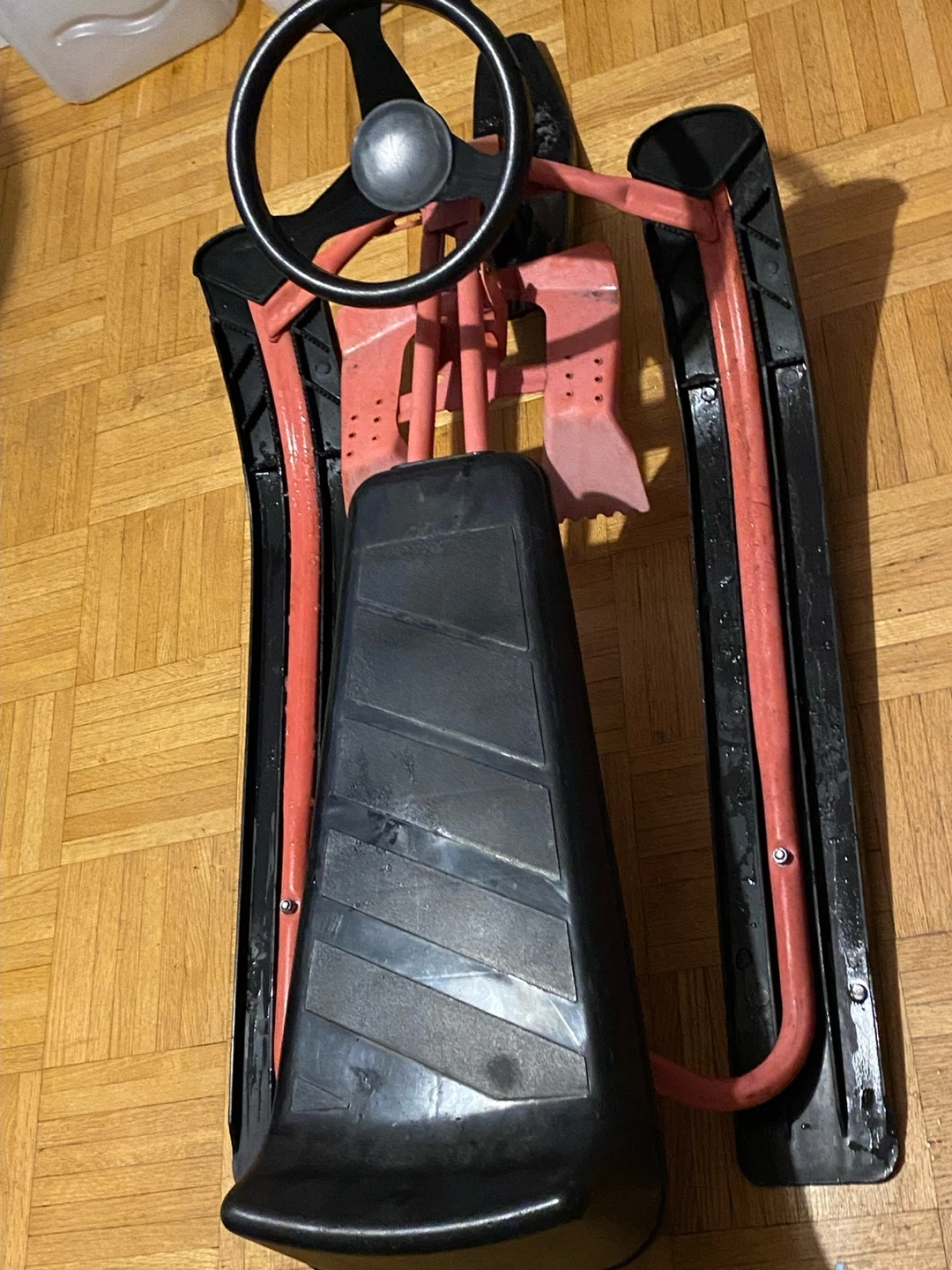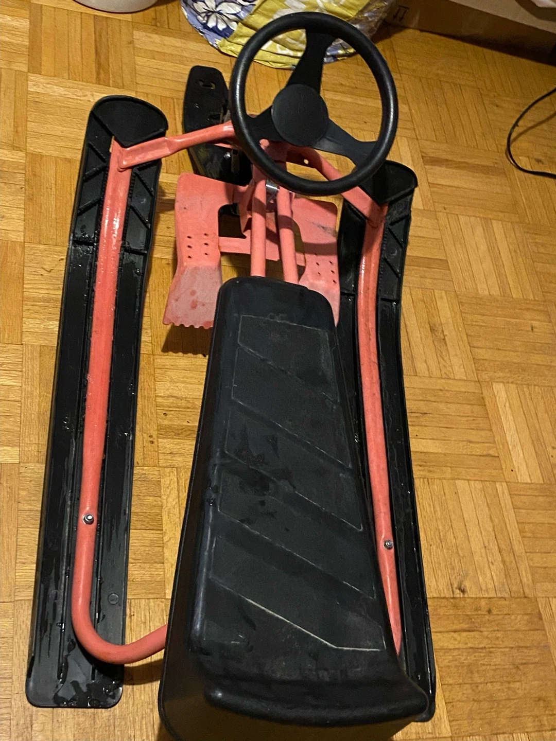 Selling a used ski sled with a steering wheel. It's in good condition and ready for some winter fun on the slopes!