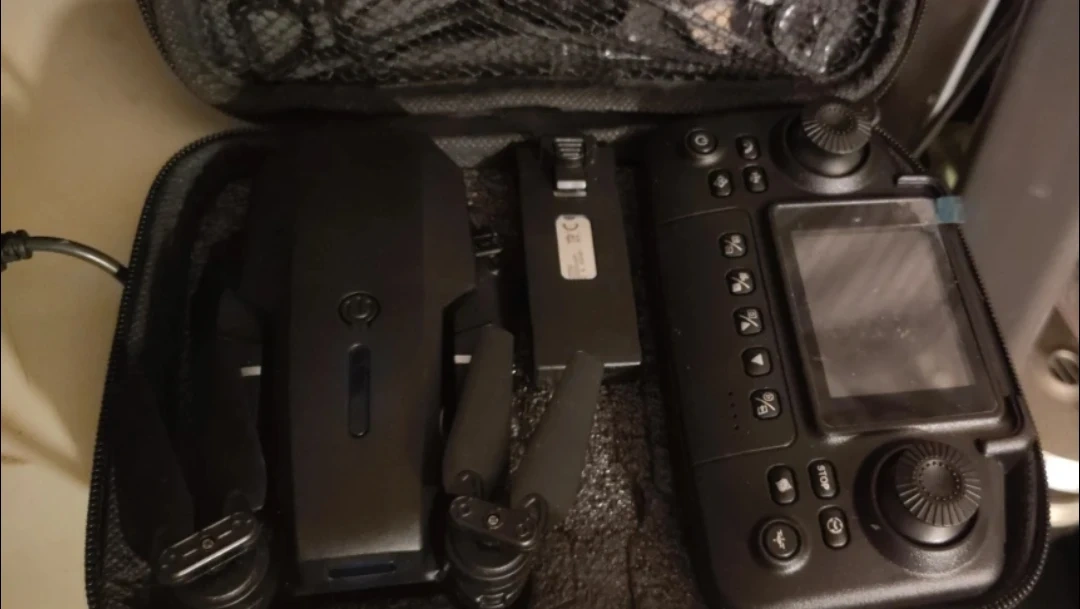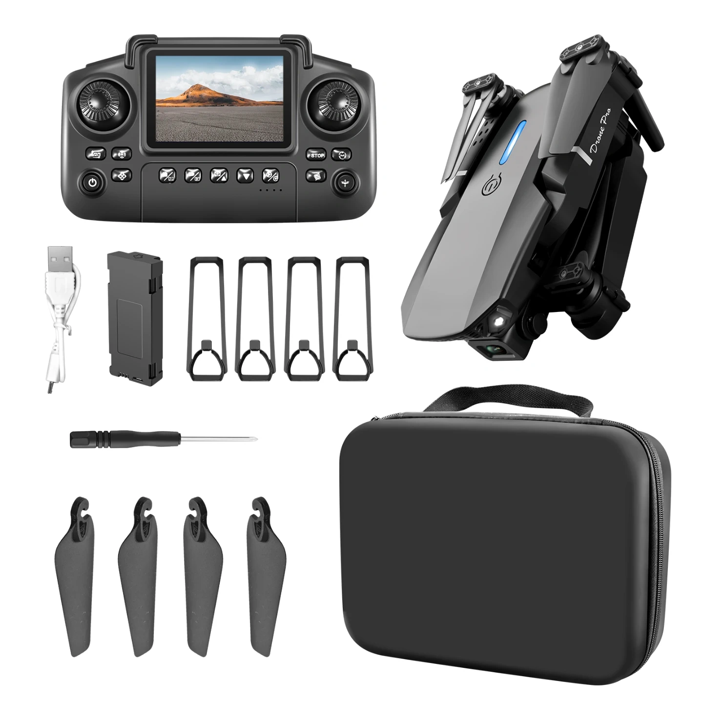 - Includes the drone, remote control, extra propellers, screwdriver, charging cable, and carrying case