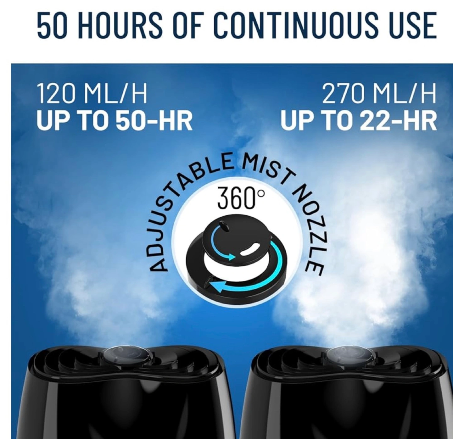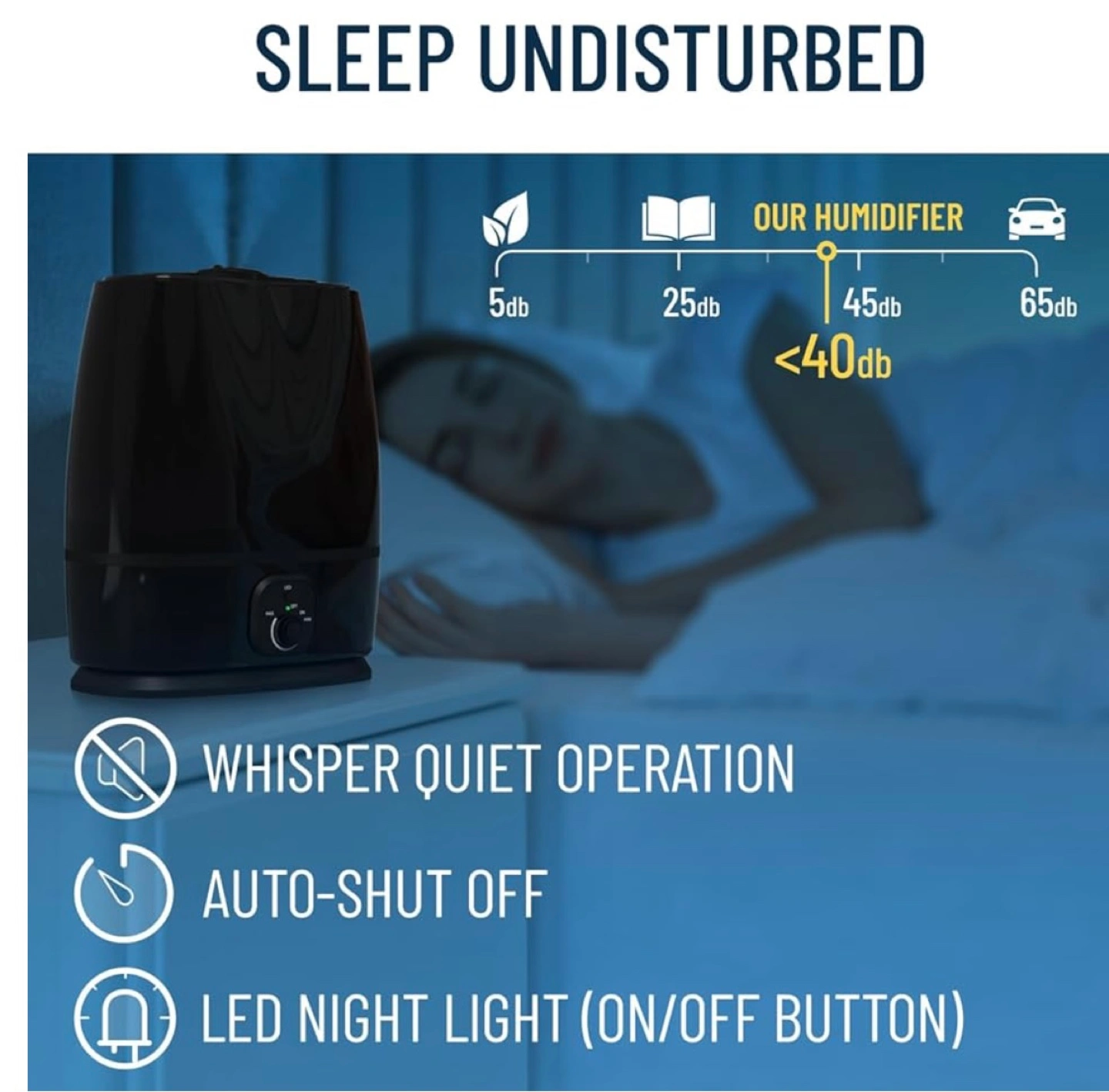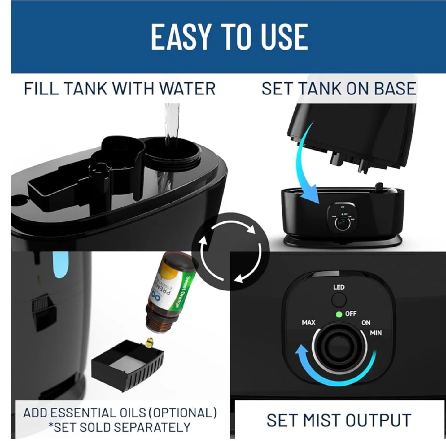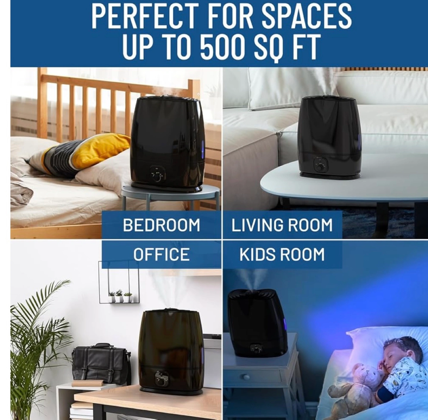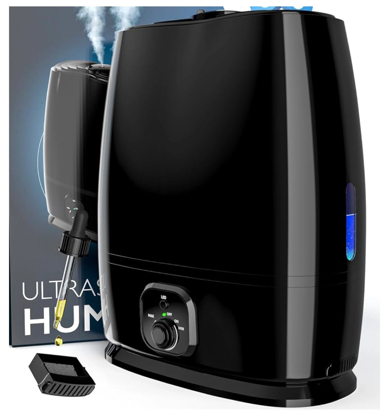 Black ultrasonic humidifier, filterless, 6L (1.6 GAL) water tank, essential oil tray, auto shut-off, whisper quiet operation, LED night light