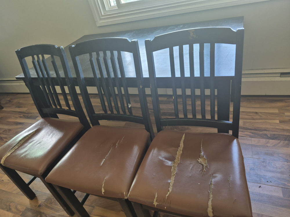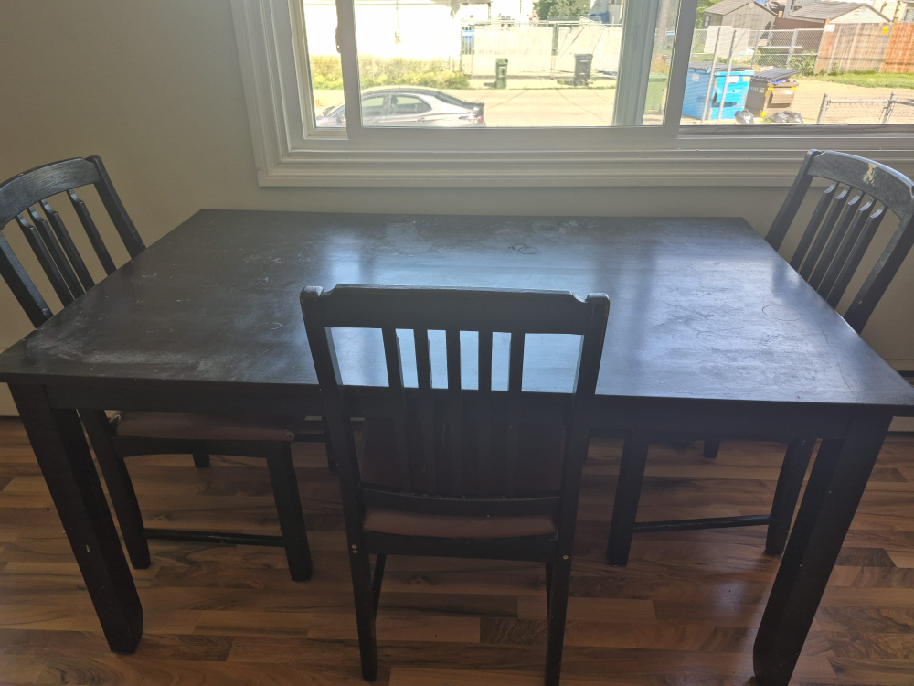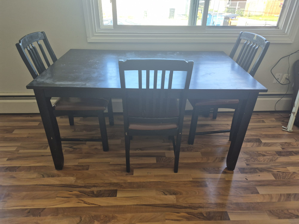 Selling a dining table with 3 chairs. The set has some wear and tear, especially on the chair seats as you can see in the photos. Still a functional set for someone looking for an affordable option!