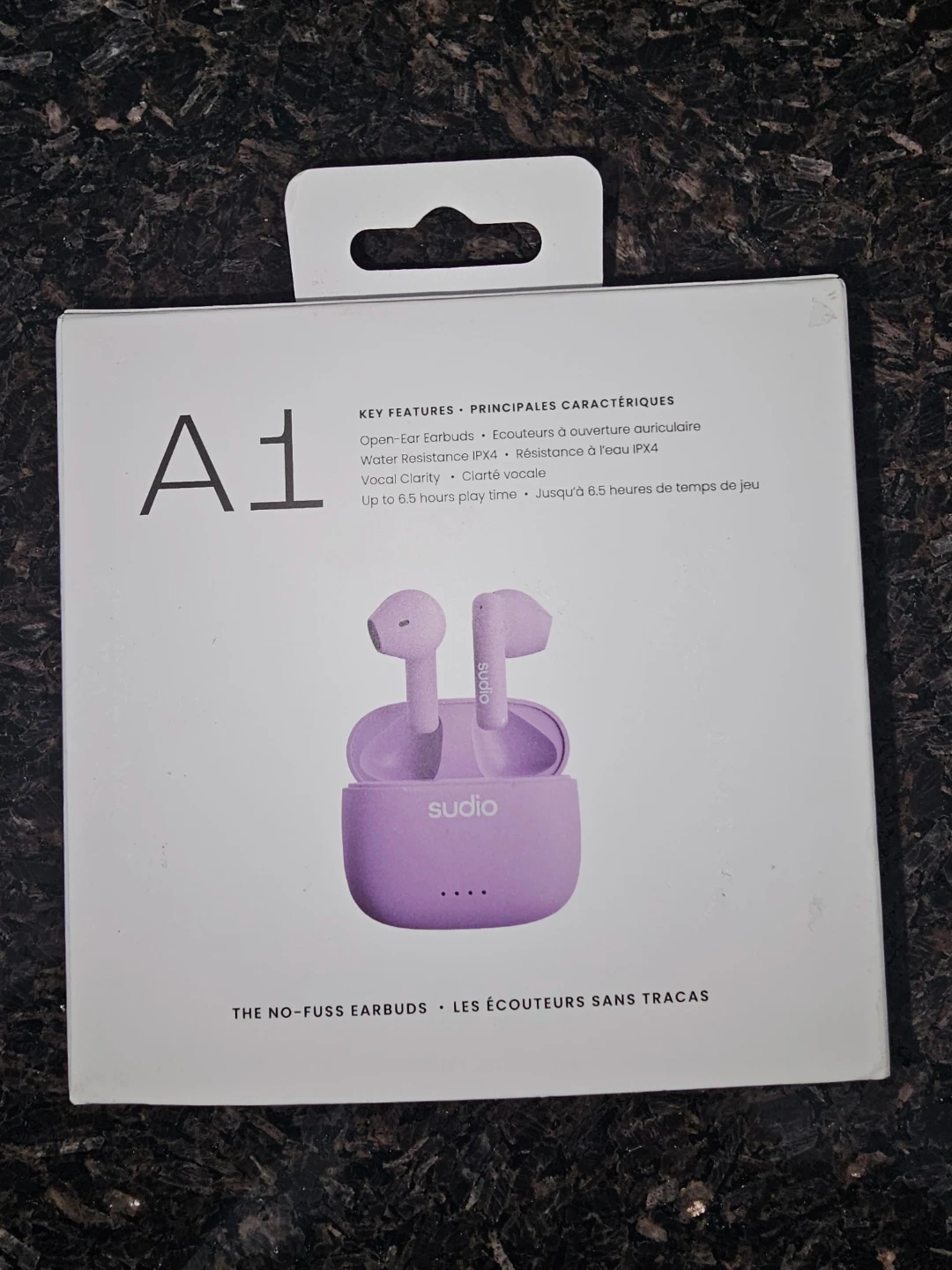 Selling a brand new pair of Sudio A1 earbuds in lavender! They are water resistant with an IPX4 rating. The box includes the earbuds themselves. They have up to 6.5 hours of play time. These are the no-fuss earbuds!