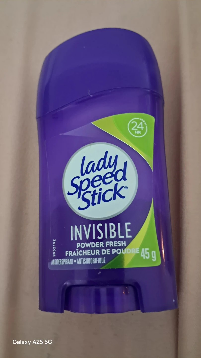 Lady Speed Stick Invisible deodorant in Powder Fresh scent. It's an antiperspirant that provides 24-hour protection. The stick is 45g.