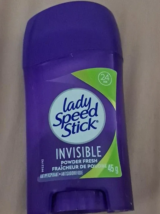 Lady Speed Stick Invisible deodorant in Powder Fresh scent. It's an antiperspirant that provides 24-hour protection. The stick is 45g.