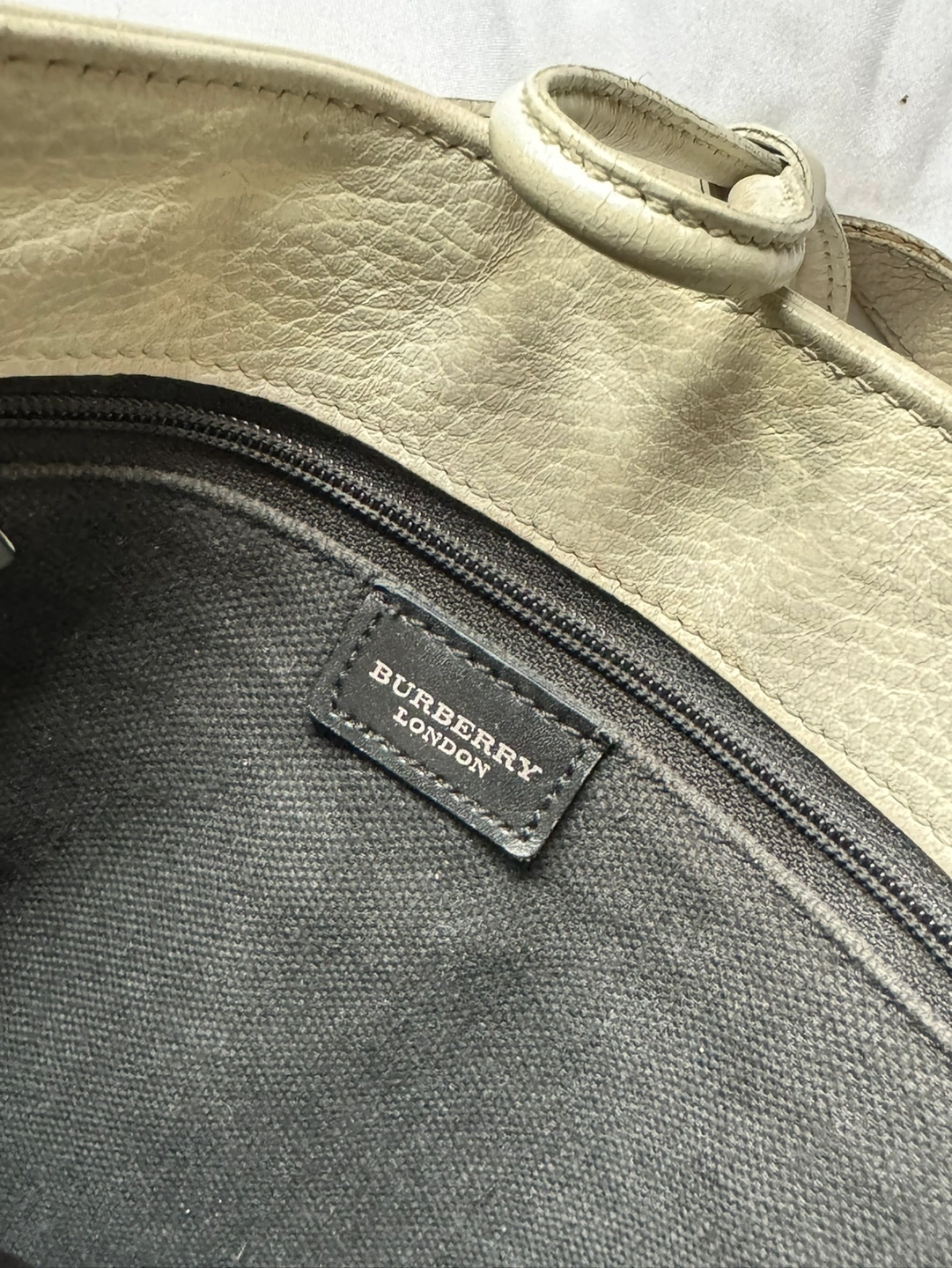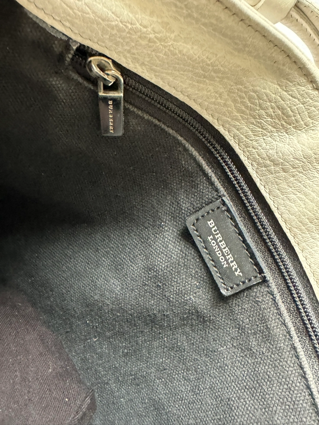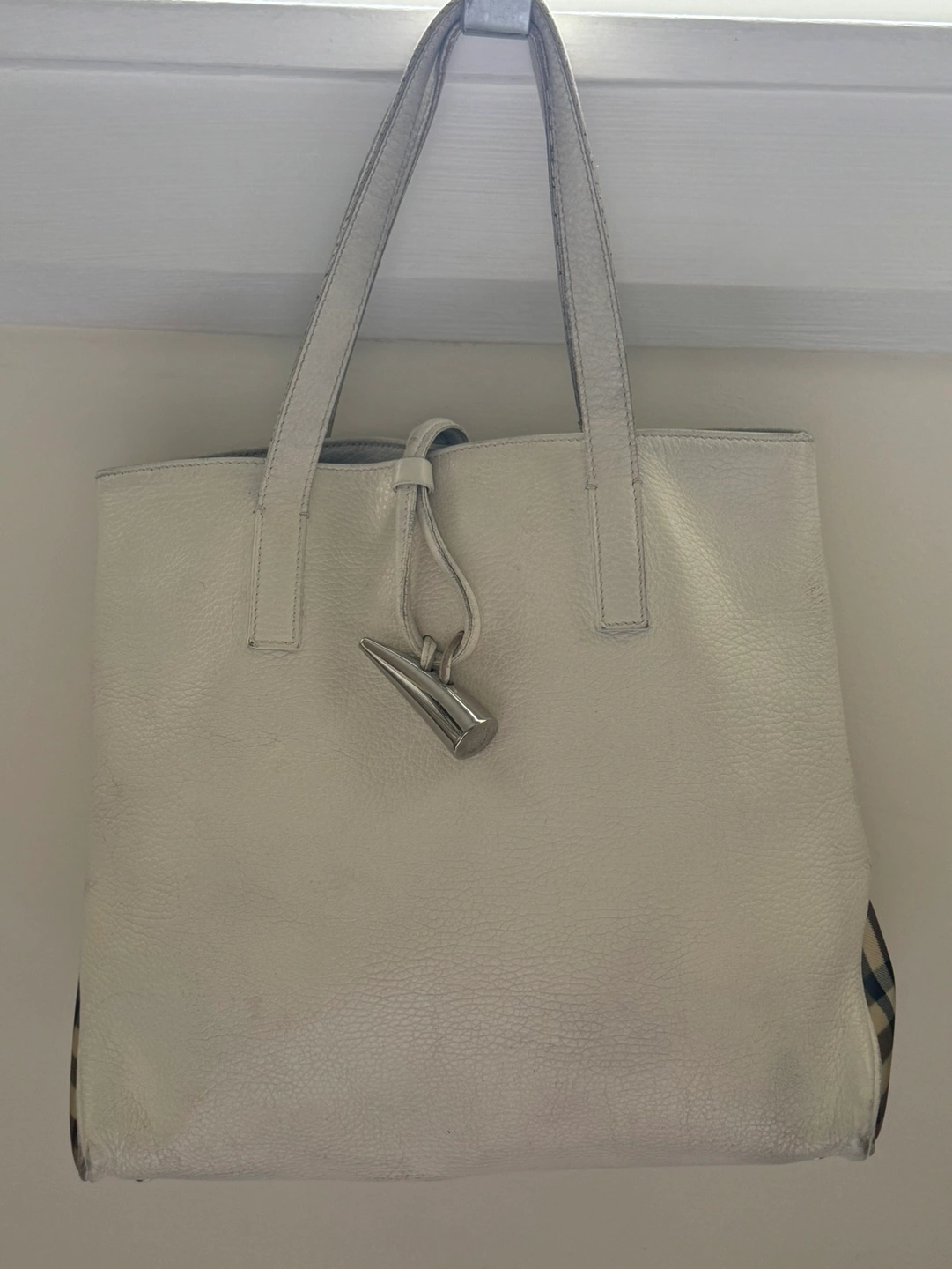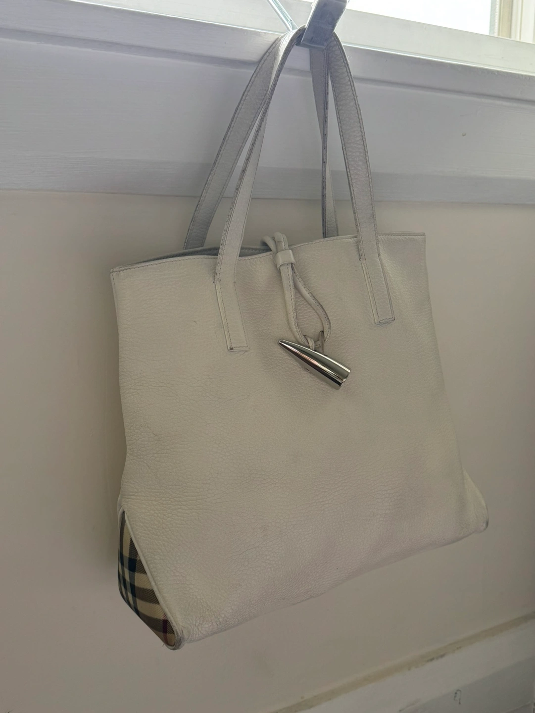 This is a classic Burberry London tote bag with a white leather exterior and a Burberry check lining. It has a top zipper closure, a small interior zipper pocket, and a silver-toned horn charm. The size is approximate.