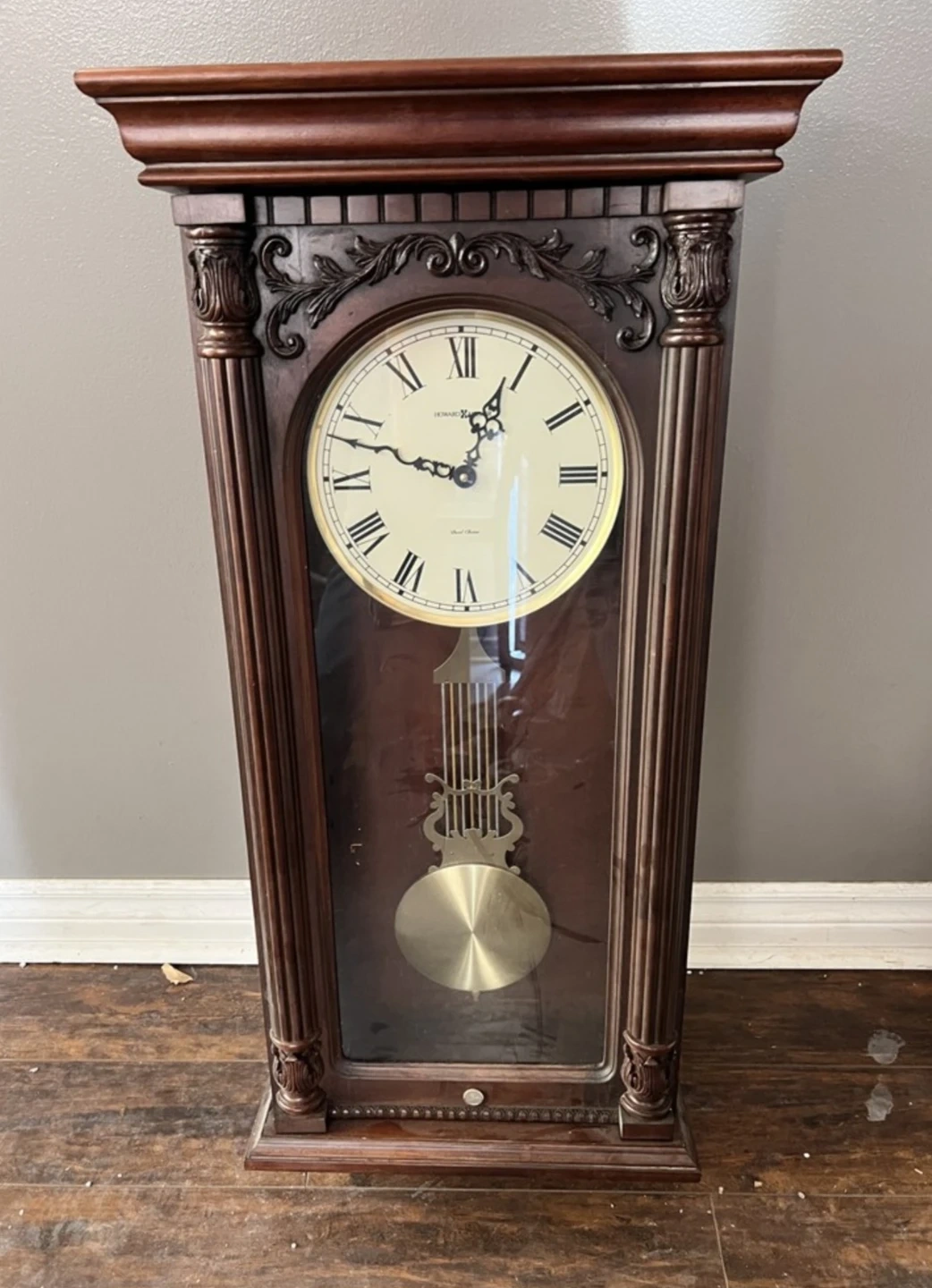 This is a Howard Miller 625-352 pendulum wall clock. It features a classic wooden case with ornate carvings and a brass pendulum. The clock face has Roman numerals for easy reading. It's a beautiful statement piece for any room!