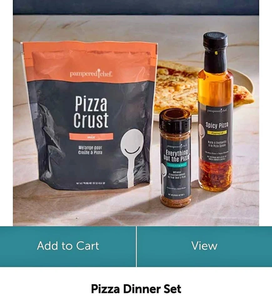 Complete Pampered Chef Pizza Dinner Set. Includes Pizza Crust mix, Everything but the Pizza seasoning, and Spicy Pizza oil. All brand new and unopened.