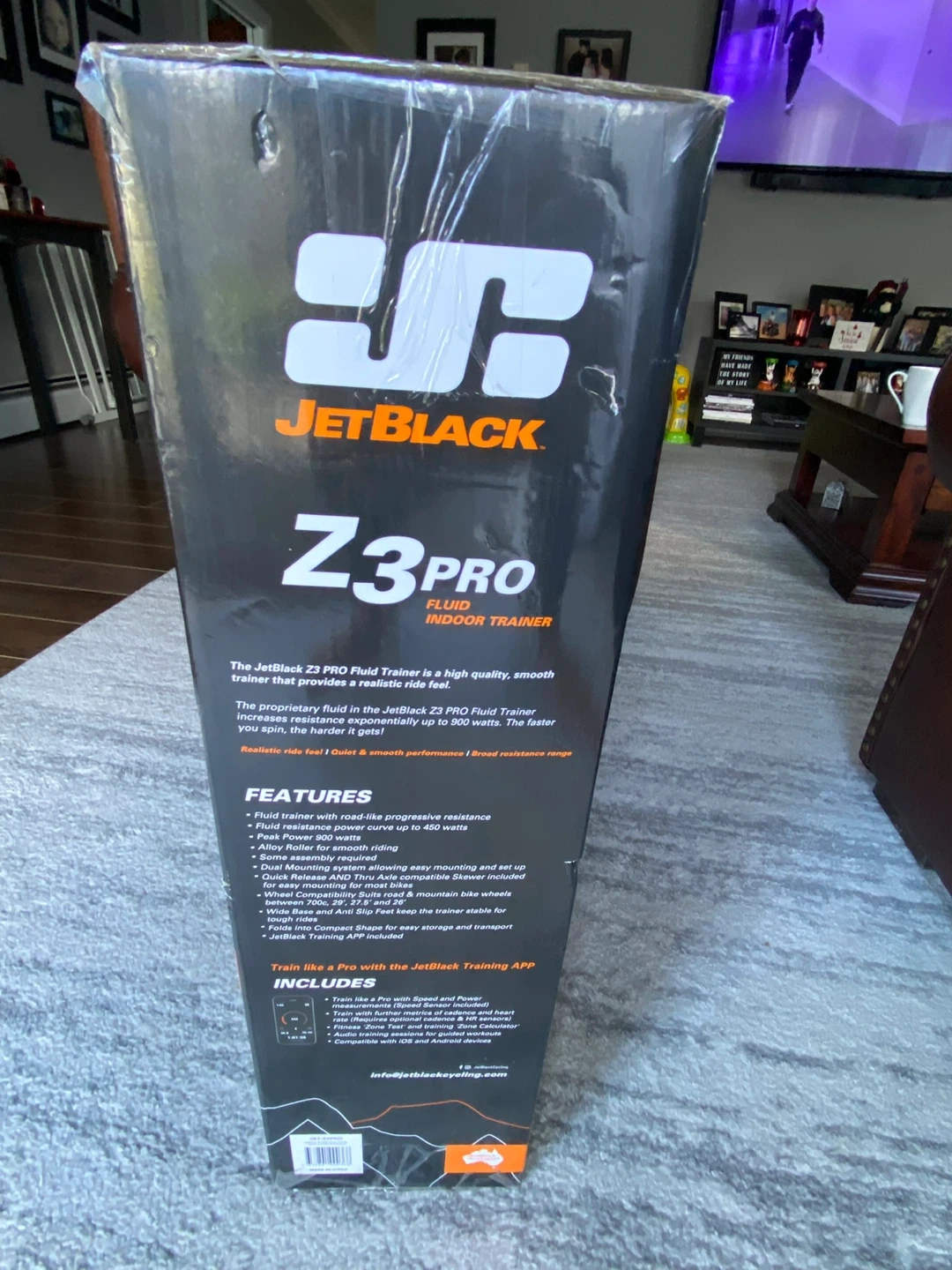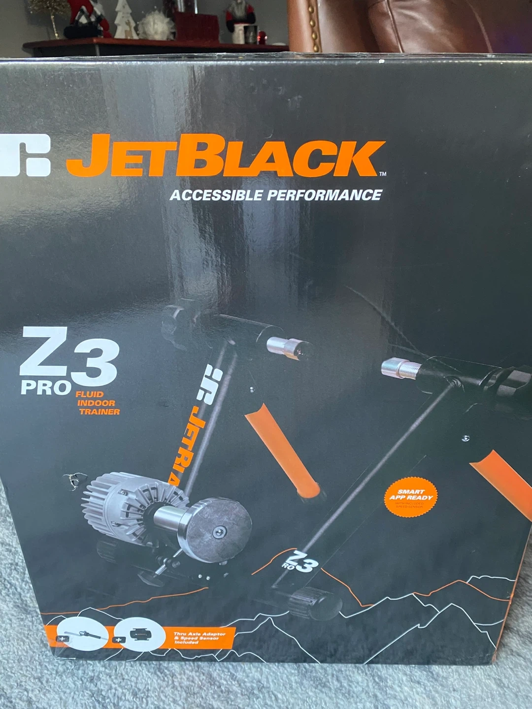 This is the JetBlack Z3 PRO Fluid Indoor Trainer. It's designed for a realistic ride feel with smooth resistance up to 900 watts. Includes thru-axle adapter and speed sensor.