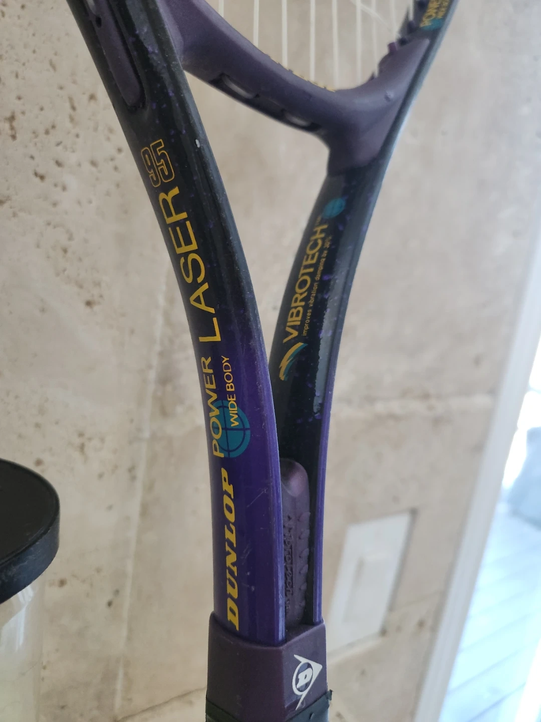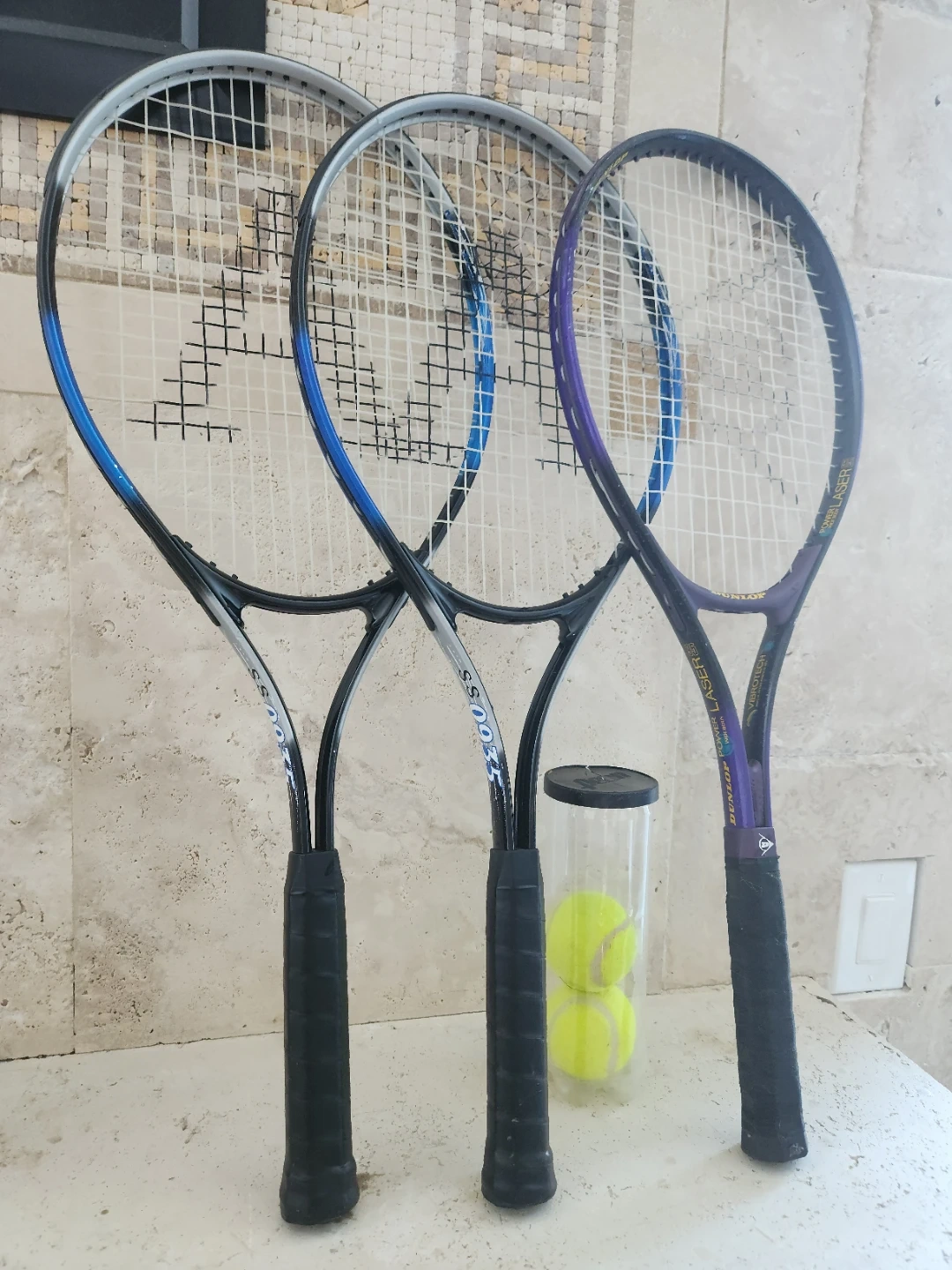 Three tennis rackets are included, two with "SS 0933" markings and one "Dunlop Power Laser Wide Body". A tube with three tennis balls is also present. A carrying bag is included.